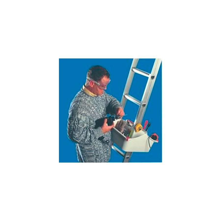 Porta-ferramentas universal para escadas, fácil de usar e montar. Fabricada em PVC para ter sempre as ferramentas à disposição sem ter que se mover do posto de trabalho. Encaixa-se sobre o montante da escada de perfil máximo 35 mm, assim como se apoia sobre um degrau de largura máxima de 100 mm.