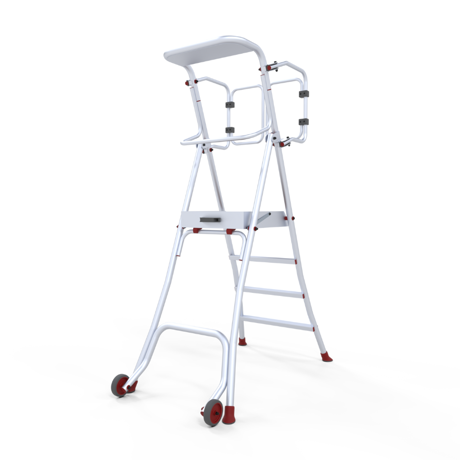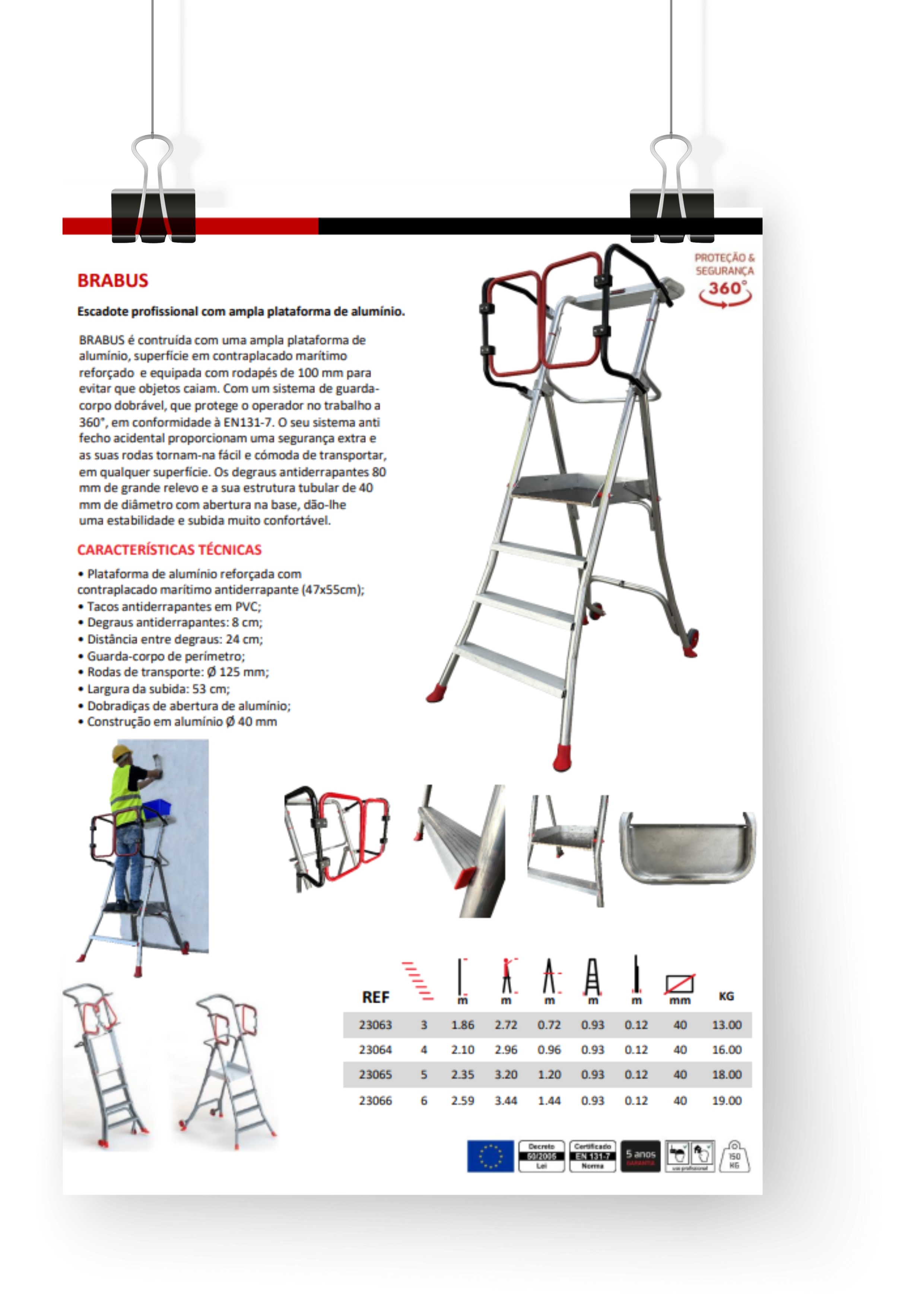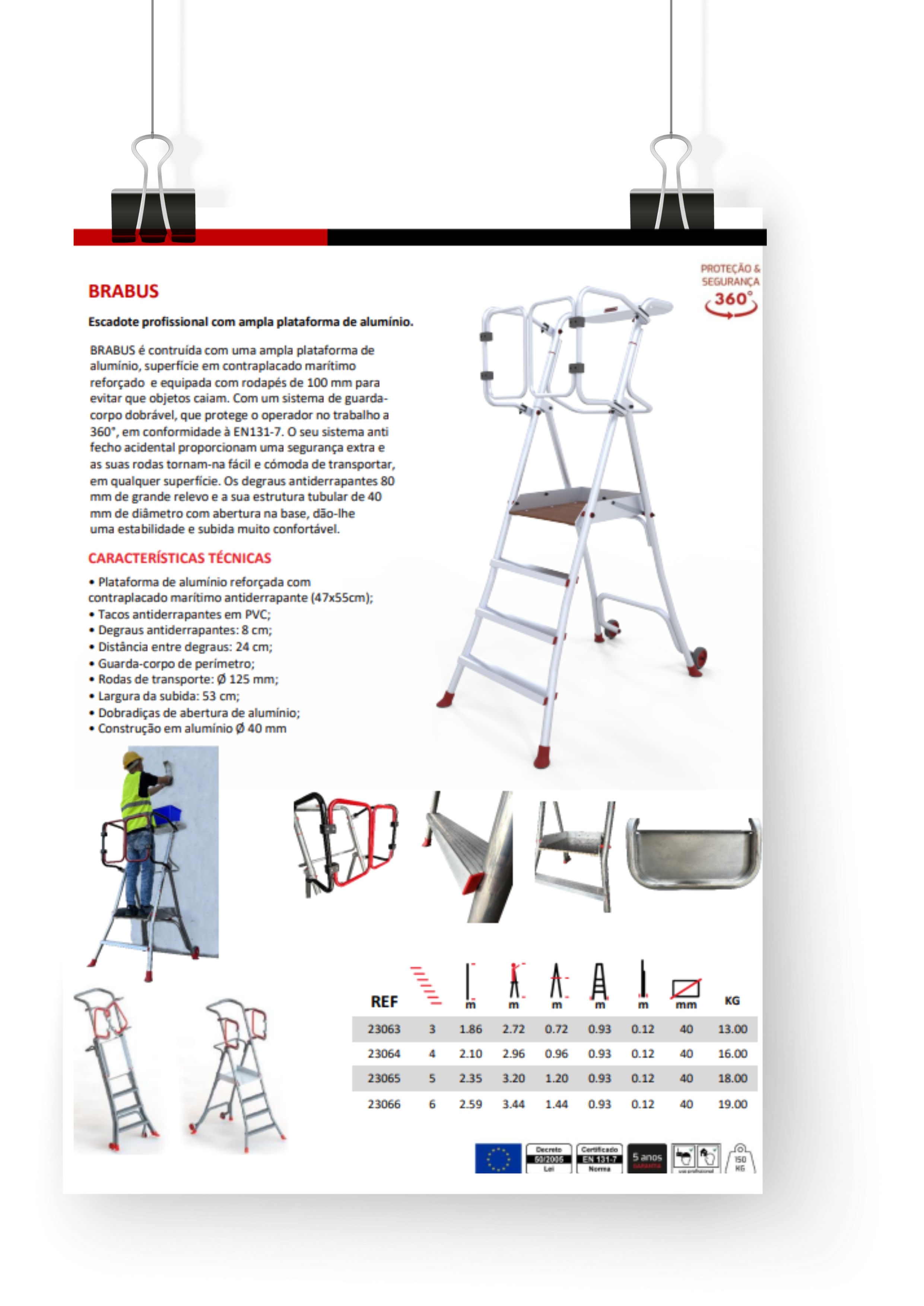 BRABUS é contruída com uma ampla plataforma de alumínio, superfície em contraplacado marítimo reforçado, e equipada com rodapés de 100 mm para evitar que objetos caiam. Com um sistema de guarda-corpo dobrável, que protege o operador no trabalho a 360°, em conformidade à EN131-7. O seu sistema anti fecho acidental proporcionam uma segurança extra e as suas rodas tornam-na fácil e cómoda de transportar, em qualquer superfície. Os degraus antiderrapantes 80 mm de grande relevo e a sua estrutura tubular de 40 mm de diâmetro com abertura na base, dão-lhe uma estabilidade e subida muito confortável.