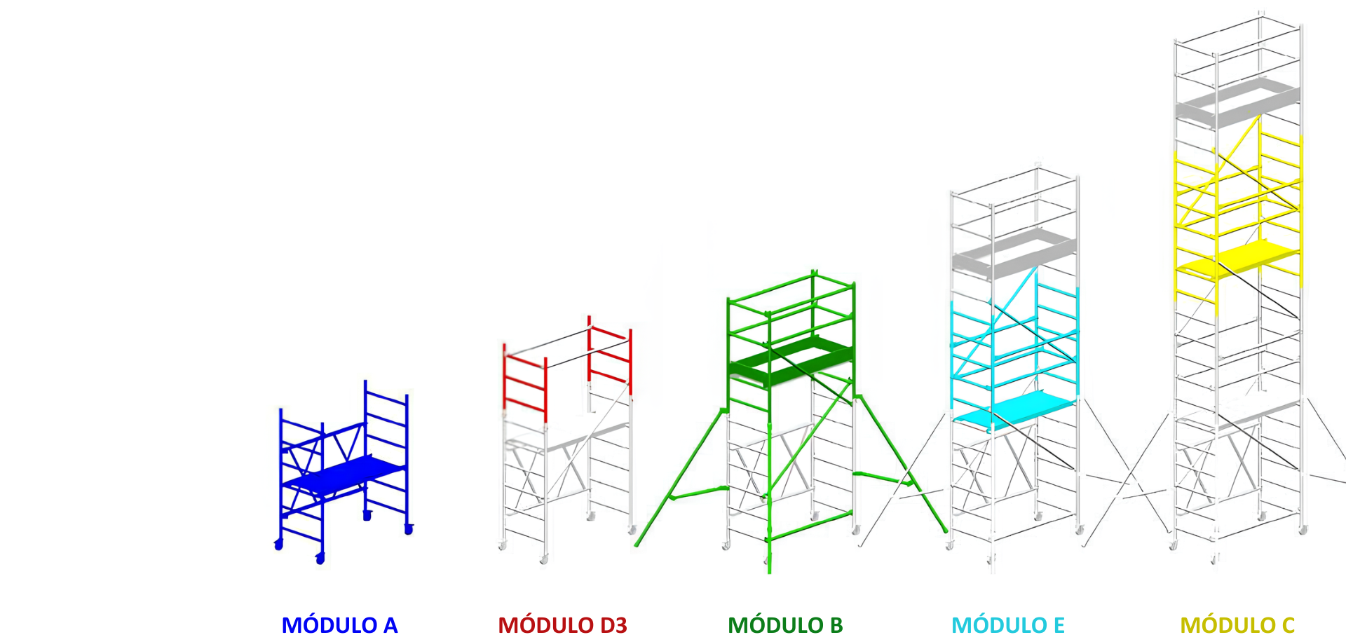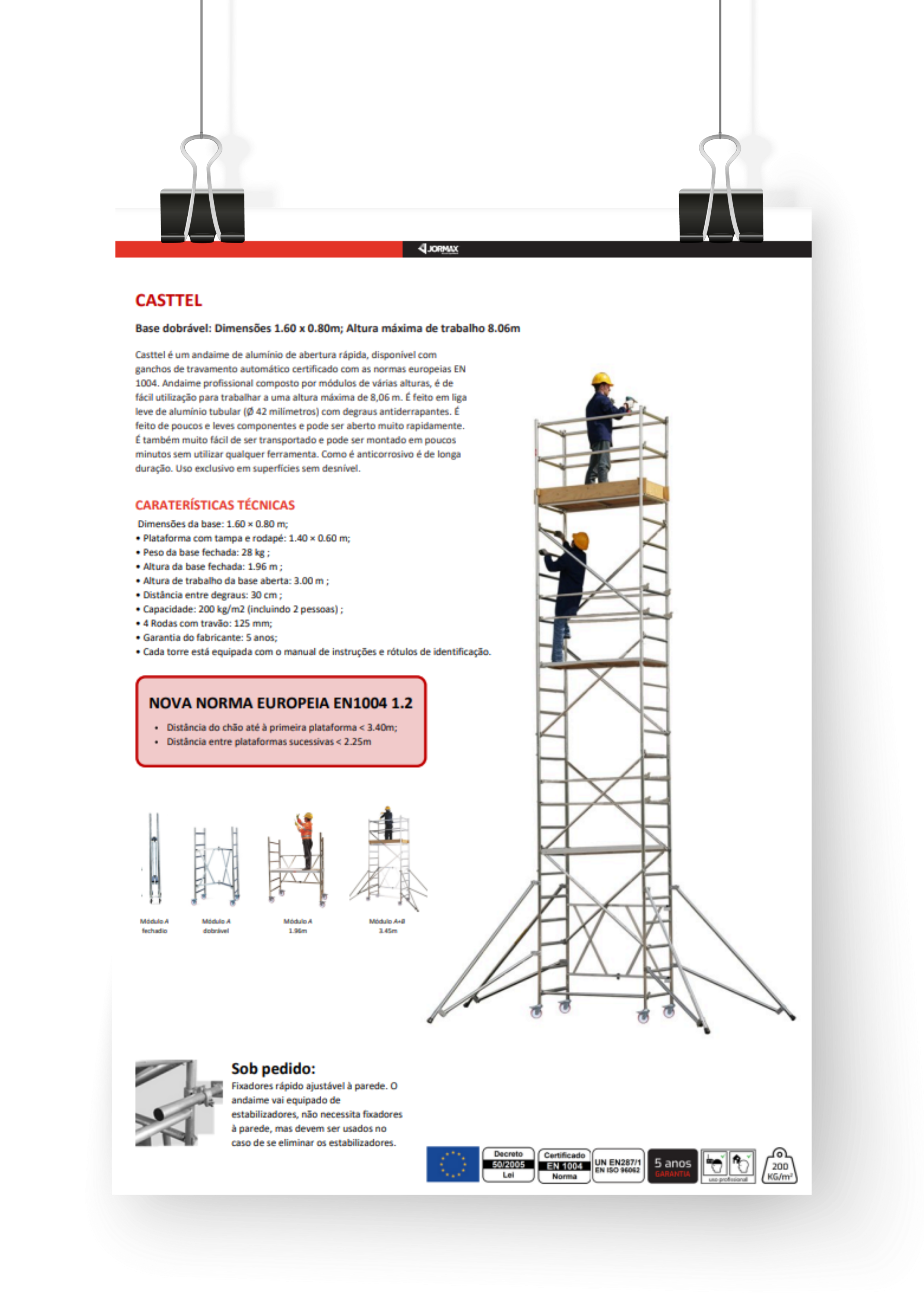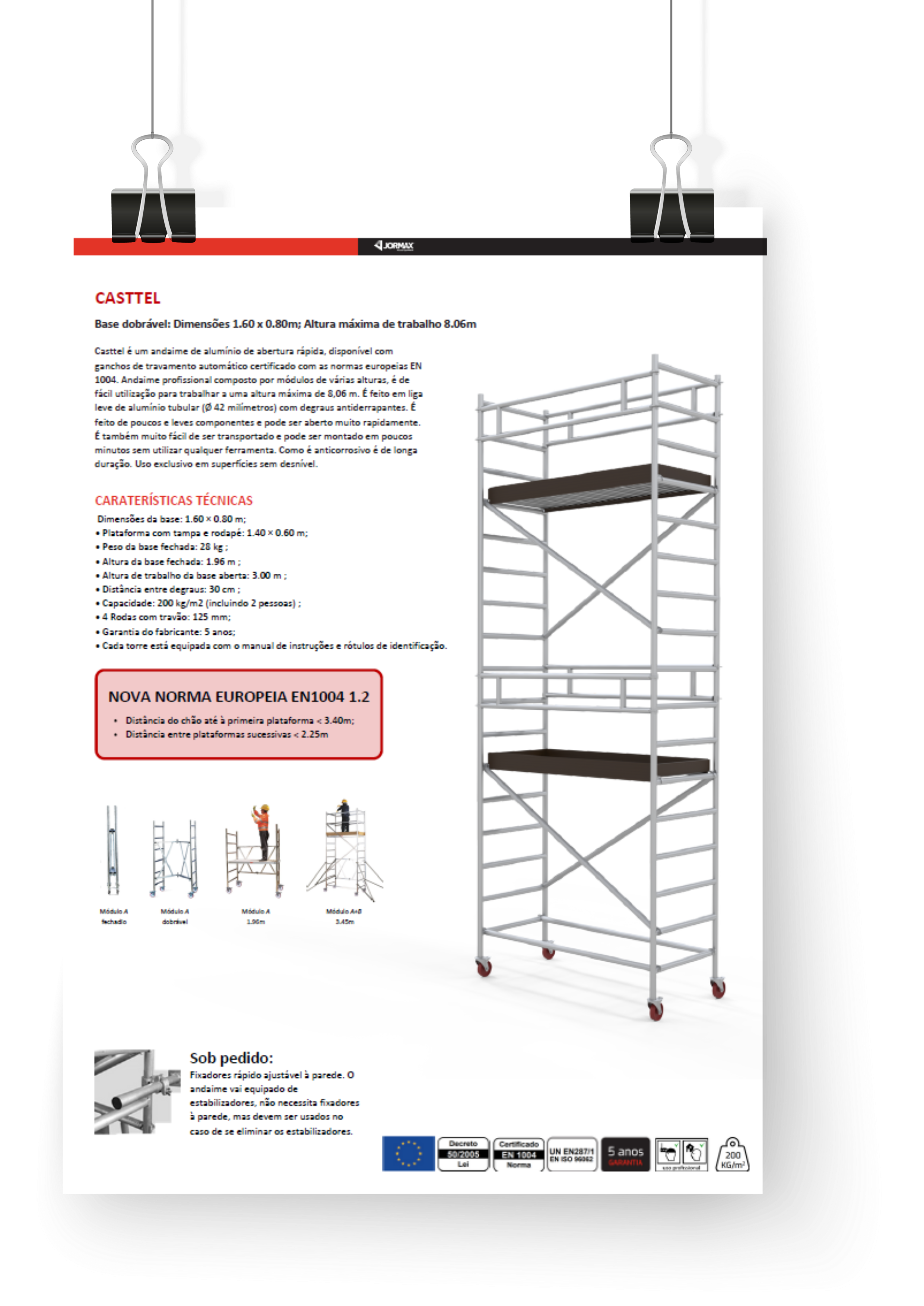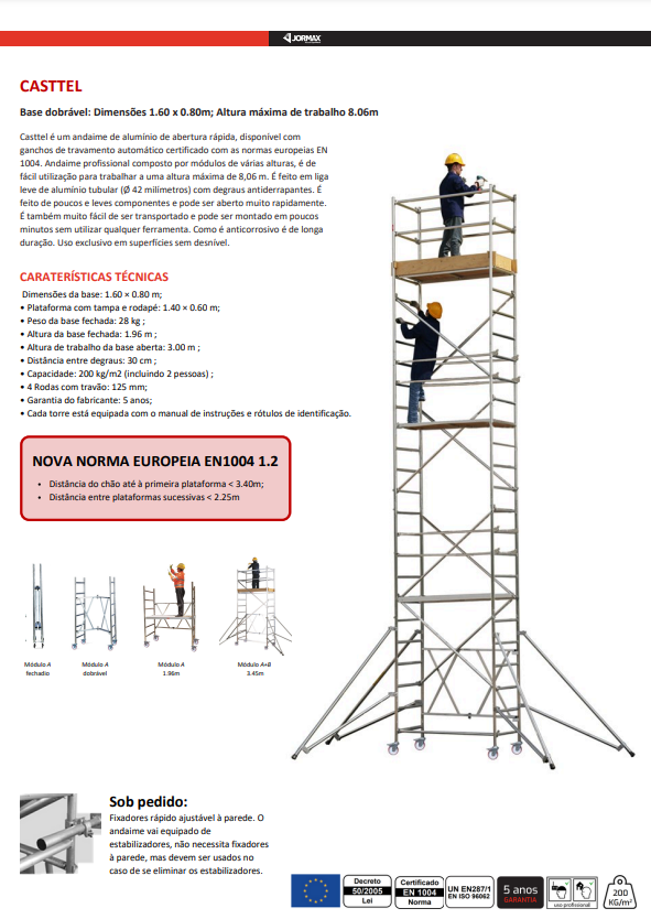 *Para uso externo, segundo a norma europei,a sem encaixe necessita de 4 contrapesos (ver peças opcionais) Este andaime inclui rodapé na plataforma terminal. Para trabalhar nas plataformas intermediárias, é necessário instalar um kit de rodapés em cada uma (MÓDULO F). É equipado com estabilizadores. No caso de serem eliminados, deve-se colocar fixadores. A Jormax reserva o direito de alterar os seus produtos ou especificações técnicas sem aviso prévio. Pode existir uma variação na medida dos produtos de (+/-) 2cm.