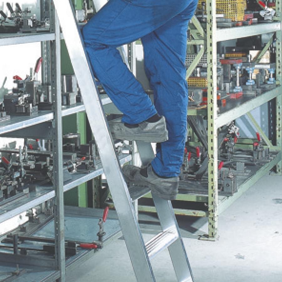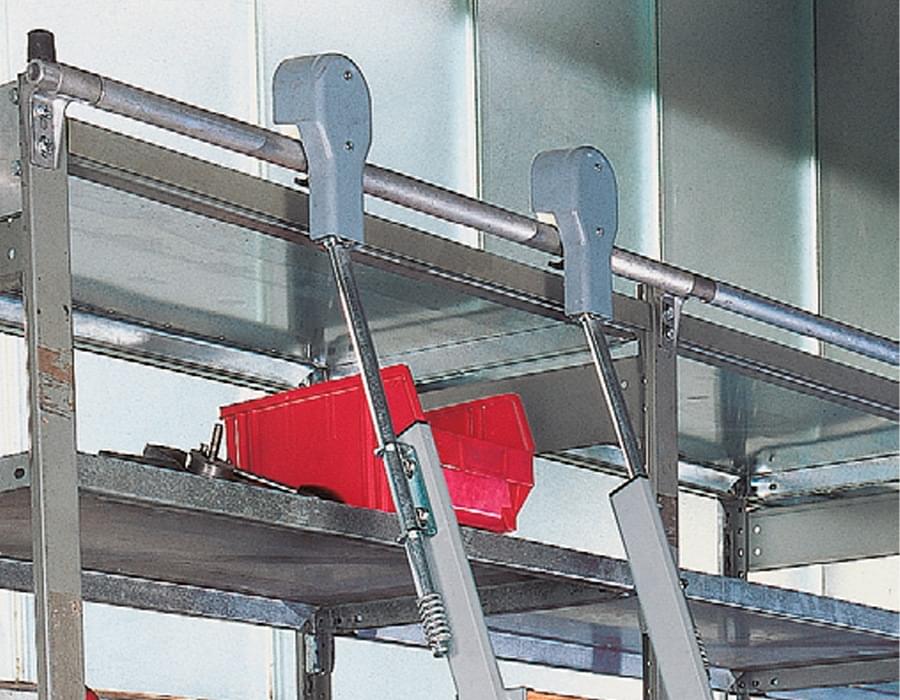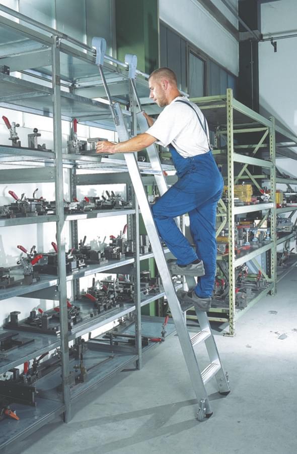 Construída em alumínio extrudido e equipada com um sofisticado sistema de conexão e corrediça sobre um carril. Para utilizar a escada basta elevar e colocar em posição de subida. Uma vez realizado o trabalho, pode-se deixar a escada aberta ou colocar em posição de descanso contra a estante. Em qualquer caso o sistema de corrediça sobre o carril fica sempre ativo e pronto para o uso. Em apoio ao solo, duas rodas de diâmetro 80 mm bloqueiam-se automaticamente para dispor da máxima segurança. O sistema autobloqueante automático ativa-se quando a escada se inclina em posição de trabalho e o utilizador sobe. Desativa-se quando o utilizador desce da escada.