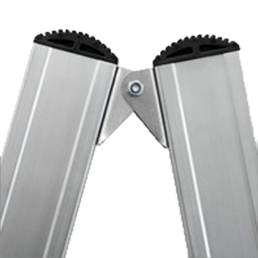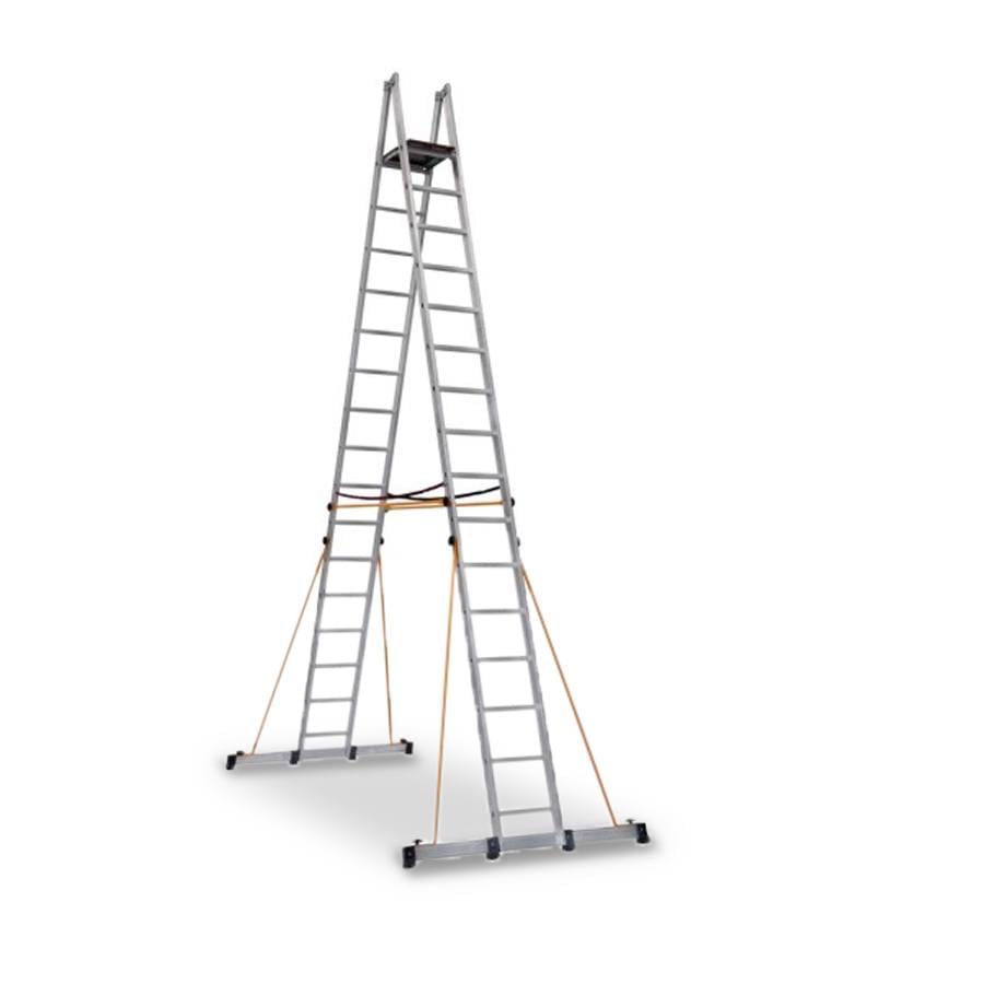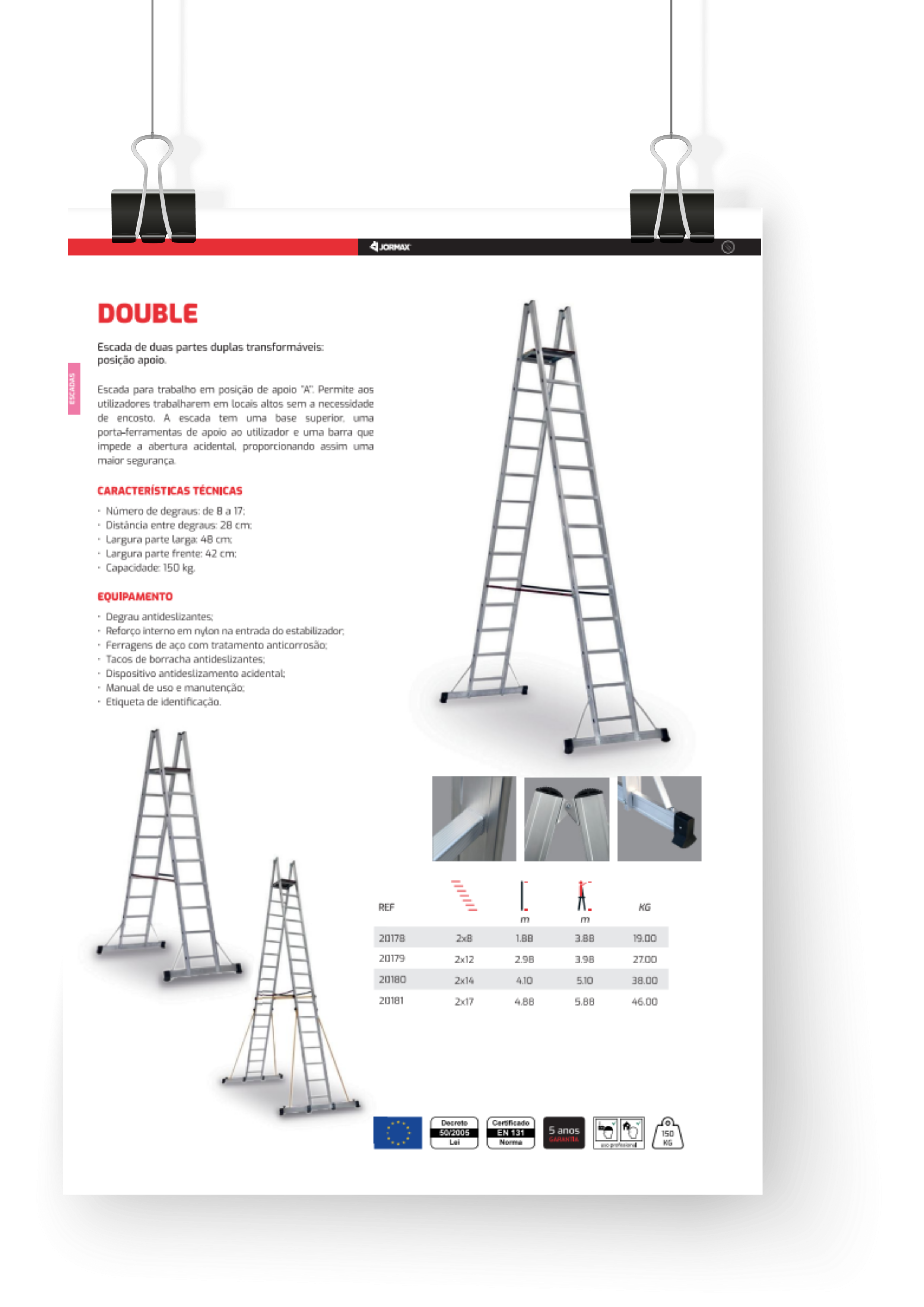 Escada para trabalho em posição de apoio “A”. Permite aos utilizadores trabalharem em locais altos sem a necessidade de encosto. A escada tem uma base superior, uma porta-ferramentas de apoio ao utilizador e uma barra que impede a abertura acidental, proporcionando assim uma maior segurança.
