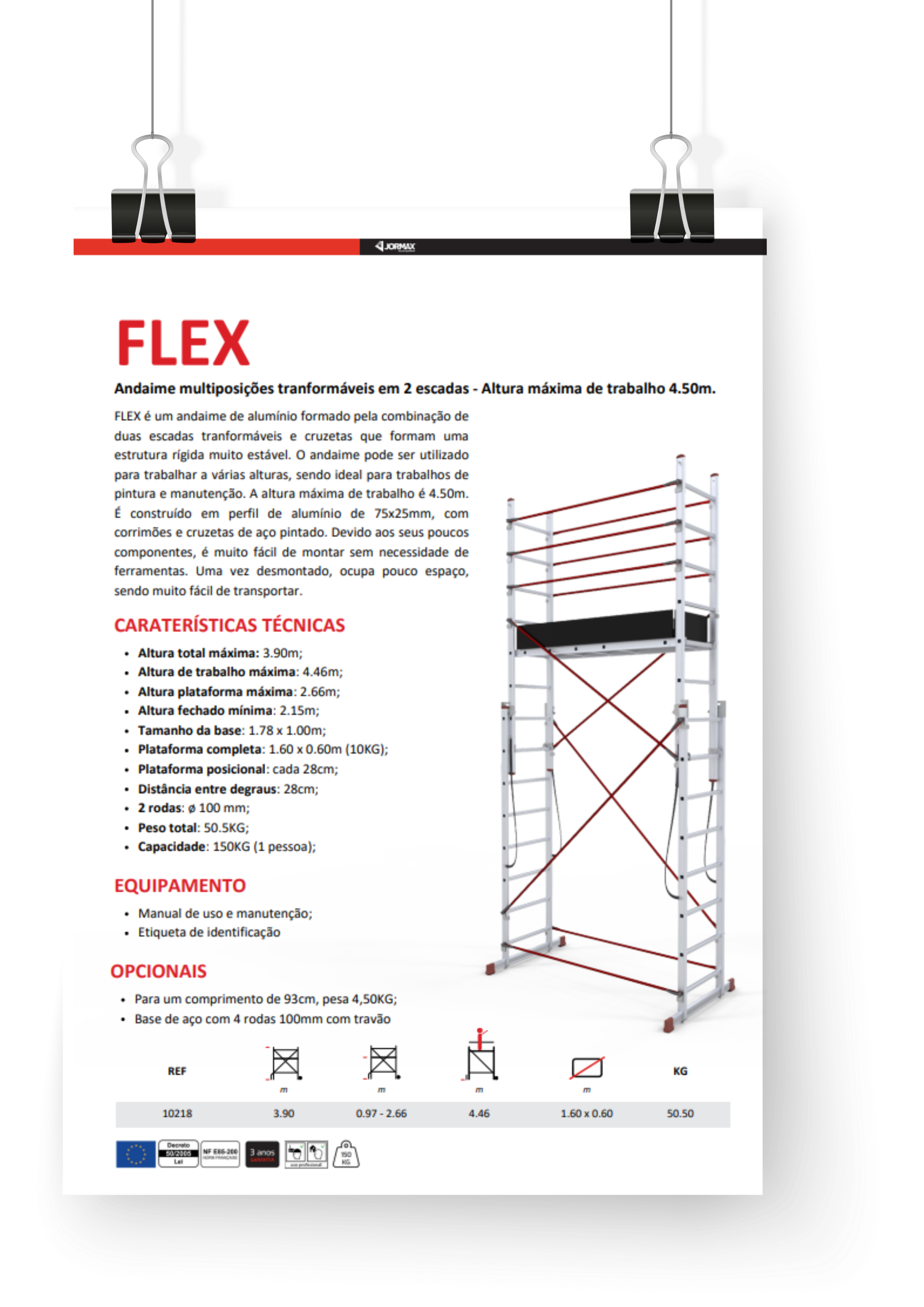Flex é um andaime de alumínio formado pela combinação de duas escadas transformáveis e cruzetas que formam uma estrutura rígida muito estável. O andaime pode ser utilizado para trabalhar a várias alturas sendo ideal para trabalhos de pintura e manutenção. A altura máxima de trabalho é de 4,50 m. É construído em perfil de alumínio de 75×25 mm com corrimões e cruzetas de aço pintado. Devido aos seus poucos componentes é muito fácil de montar sem necessidade de ferramentas. Uma vez desmontado ocupa muito pouco espaço, sendo muito fácil de transportar.