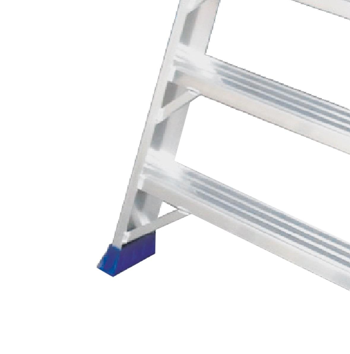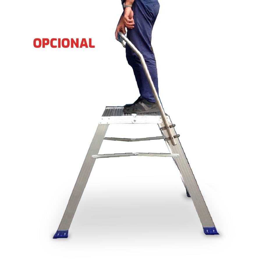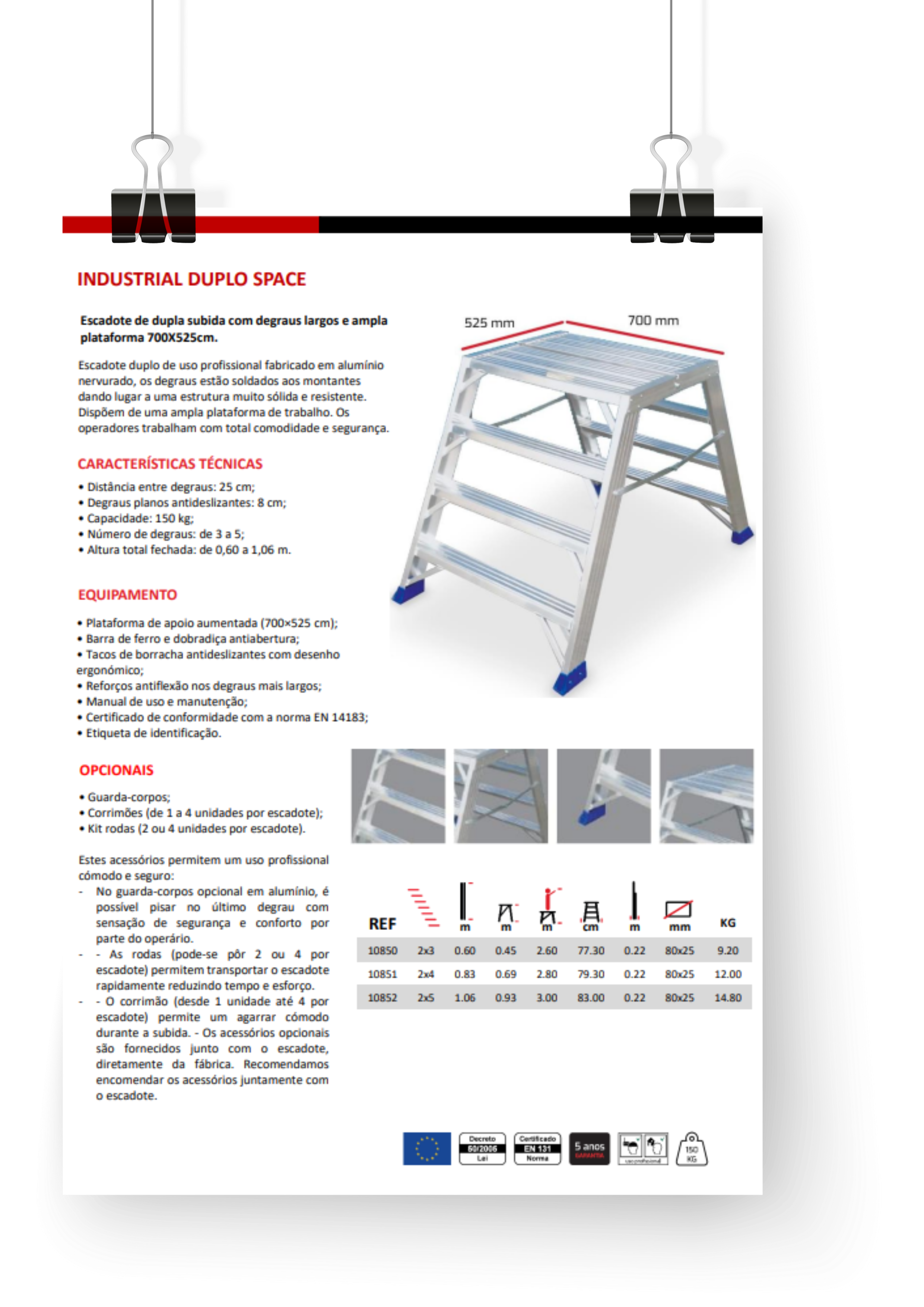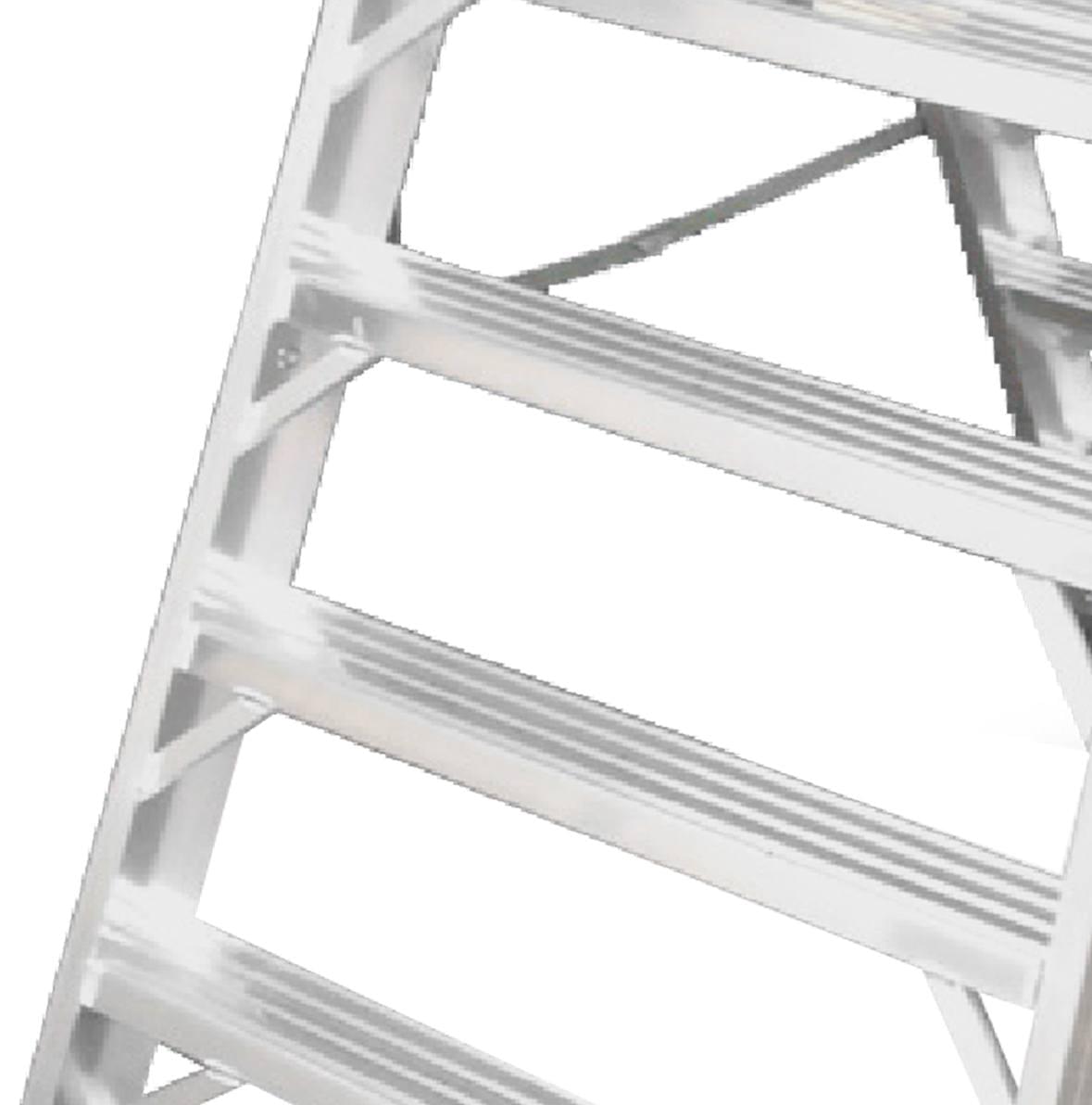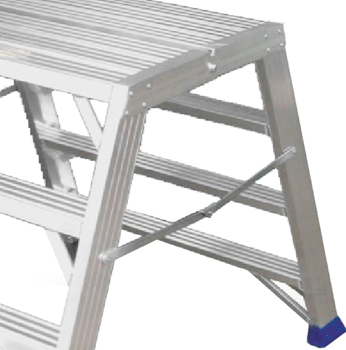 Escadote duplo de uso profissional fabricado em alumínio nervurado, os degraus estão soldados aos montantes dando lugar a uma estrutura muito sólida e resistente. Dispõem de uma ampla plataforma de trabalho. Os operadores trabalham com total comodidade e segurança.