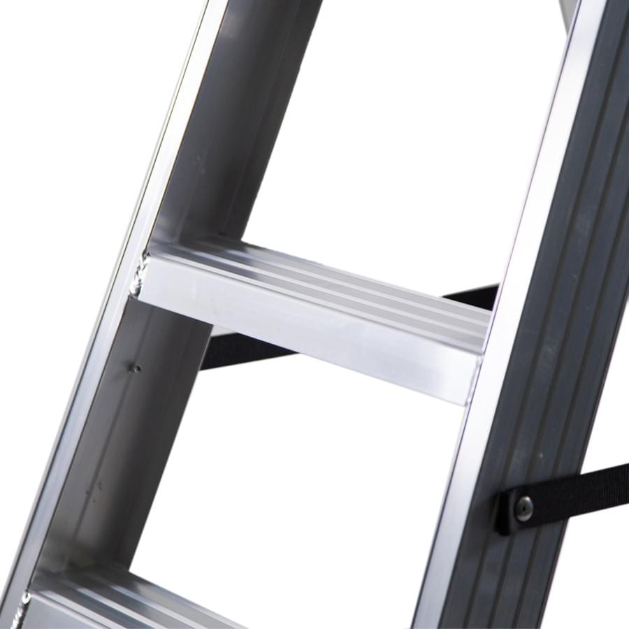 Escadote de uso profissional fabricado em alumínio nervurado, os degraus estão soldados aos montantes dando lugar a uma estrutura muito mais sólida e resistente.