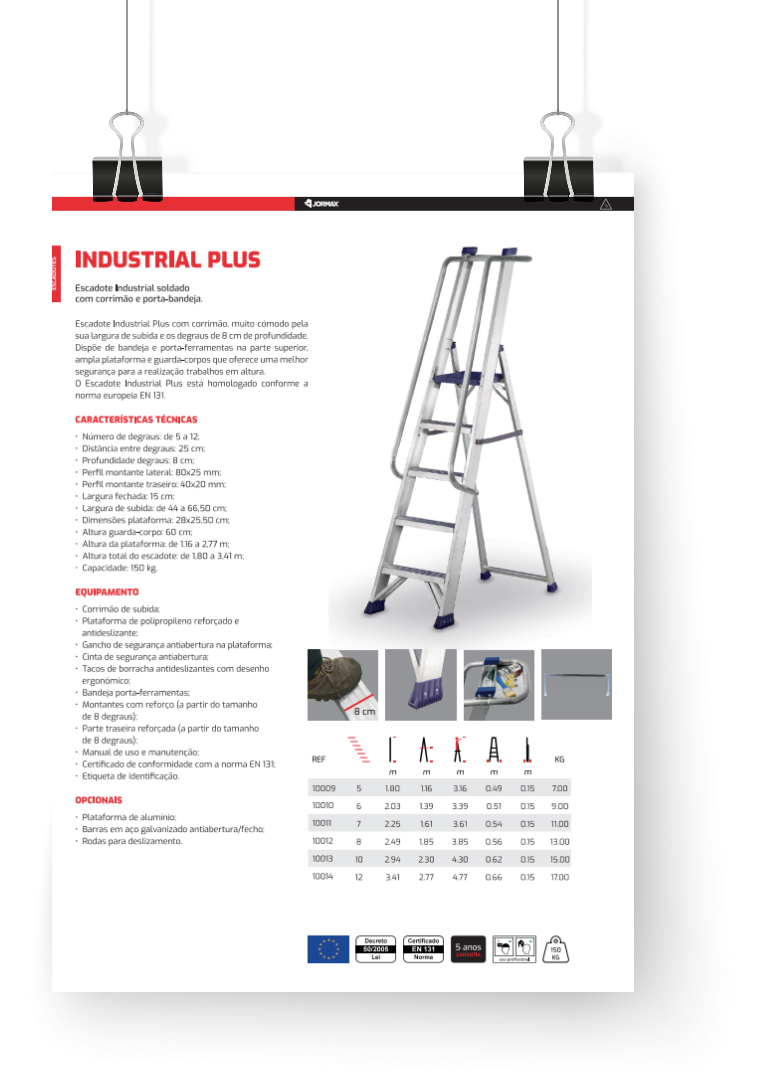 plataforma e guarda-corpos que oferece uma melhor segurança para a realização de trabalhos em altura. O escadote Industrial Plus está homologado conforme a norma europeia EN 131.