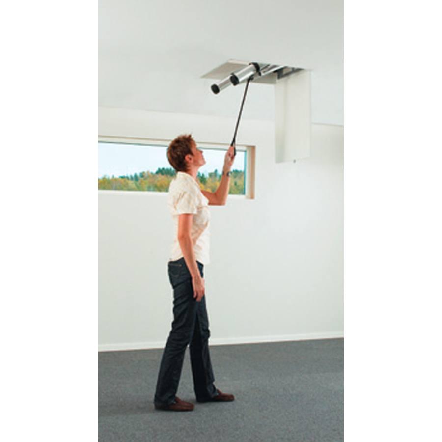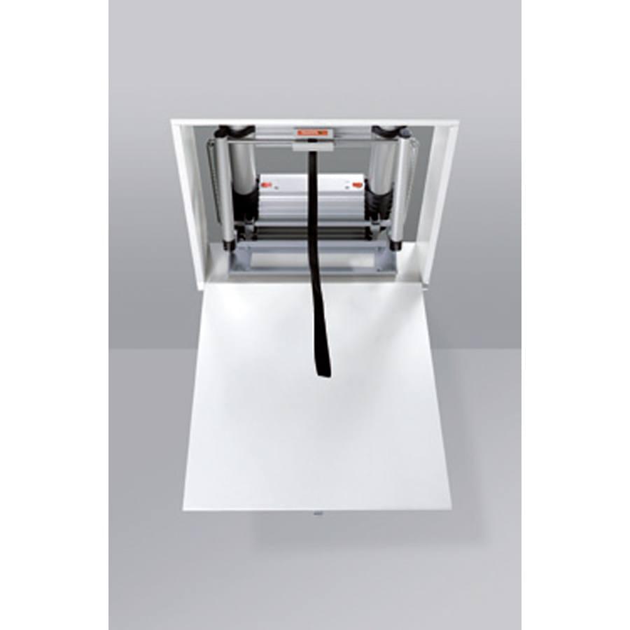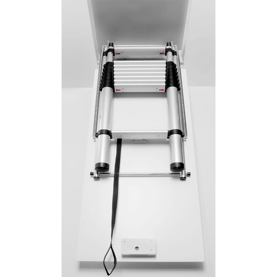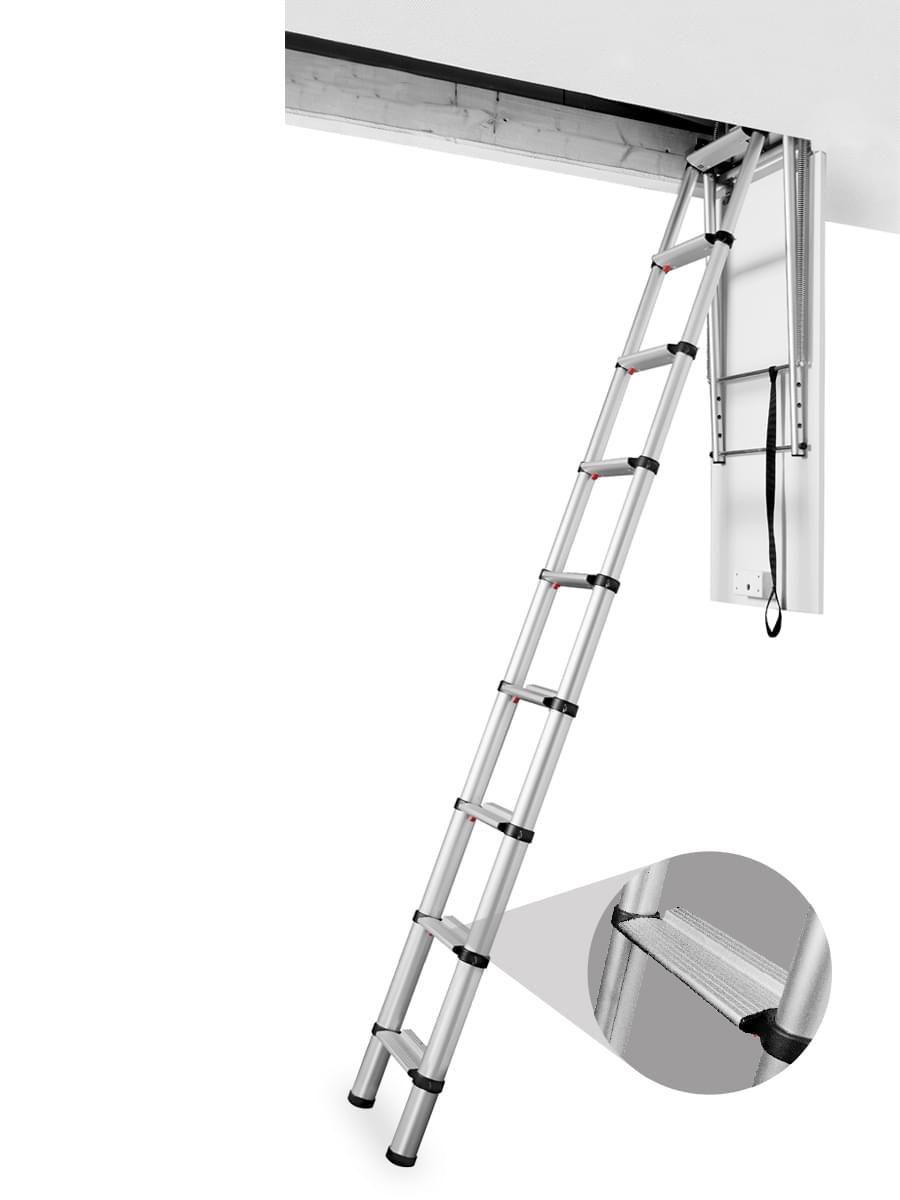 Fabricada em alumínio anodizado muito resistente, desenhada especialmente para uso interno. Está concebida para montagem fácil e rápida. É bastante leve e apresenta uma ampla rampa de subida com degraus de 9 cm que permitem a subida e descida com comodidade e segurança. Para abrir a escada basta libertar o gancho de segurança e em poucos segundos a escada irá abrir-se. Para fechar a escada deve-se carregar nas duas patilhas de segurança posicionadas no primeiro degrau e depois empurrar a escada para cima, sem qualquer esforço, graças a um sistema de molas. Disponível em dois tamanhos com 9 e 10 degraus. Loft tem dimensões mínimas de abertura graças ao sistema telescópico. A escada requer apenas cerca de 1,40 m de distância à parede aberta. A caixa é de aço galvanizado com tampa de madeira, já equipada com fechadura e barra de abertura.