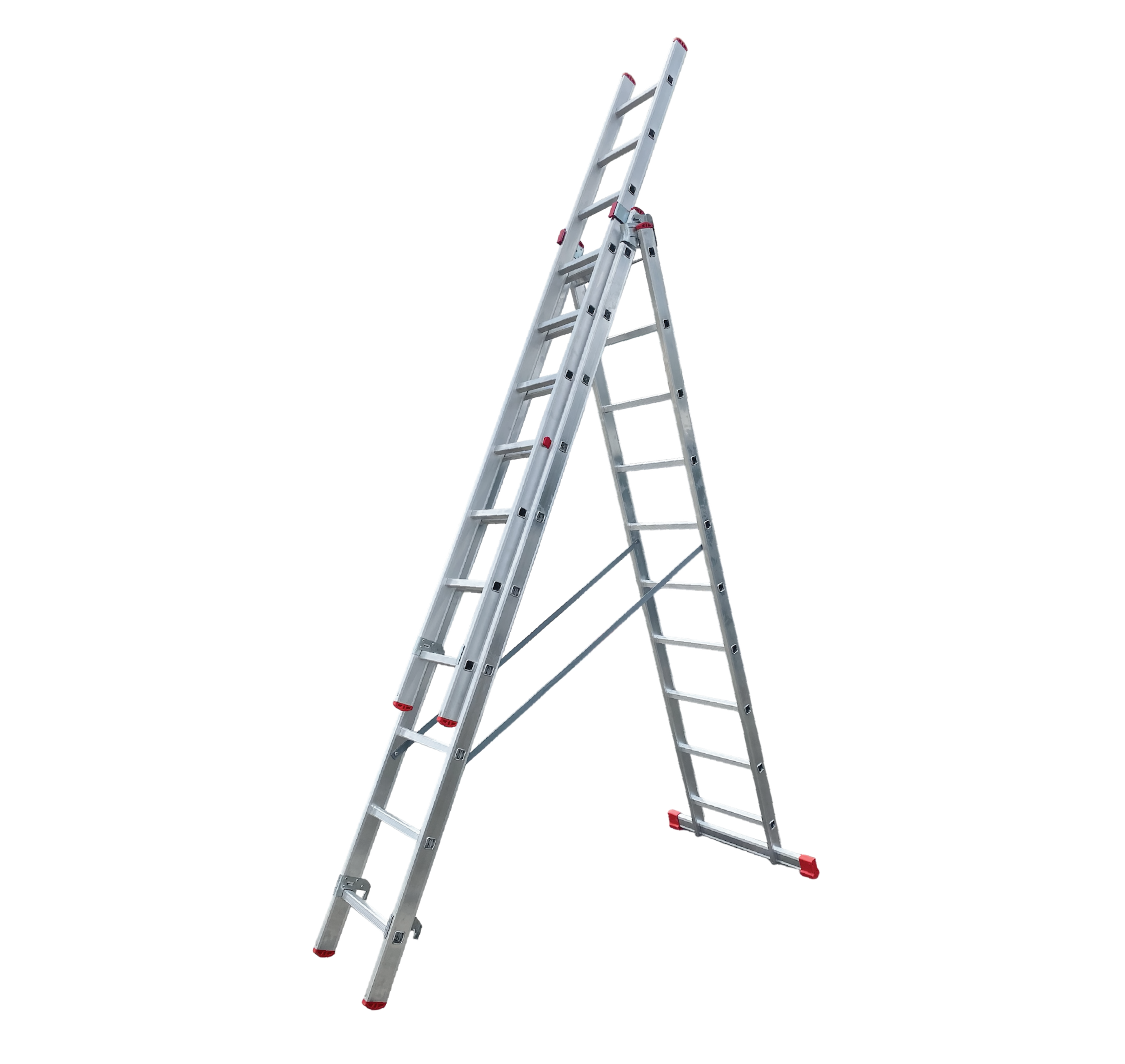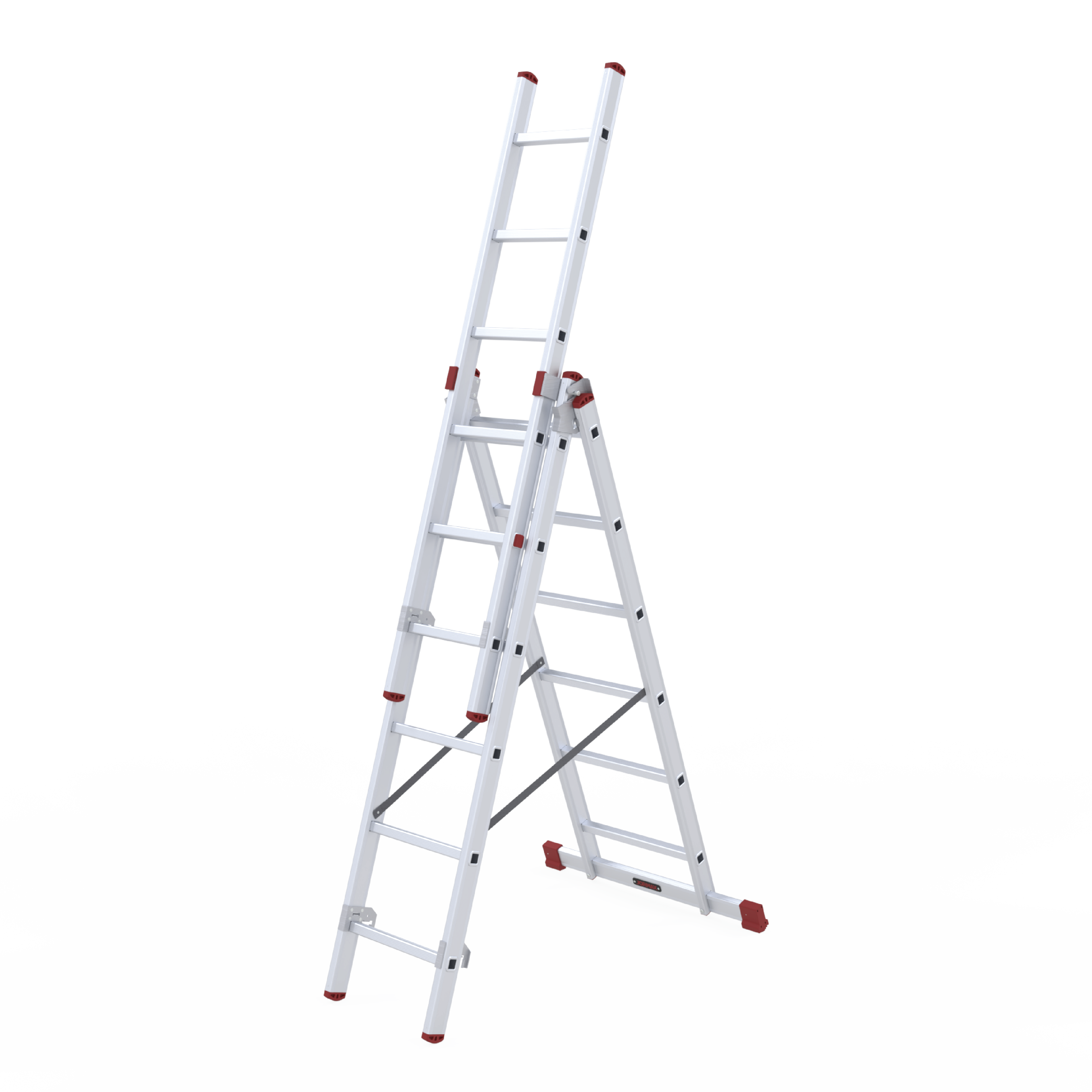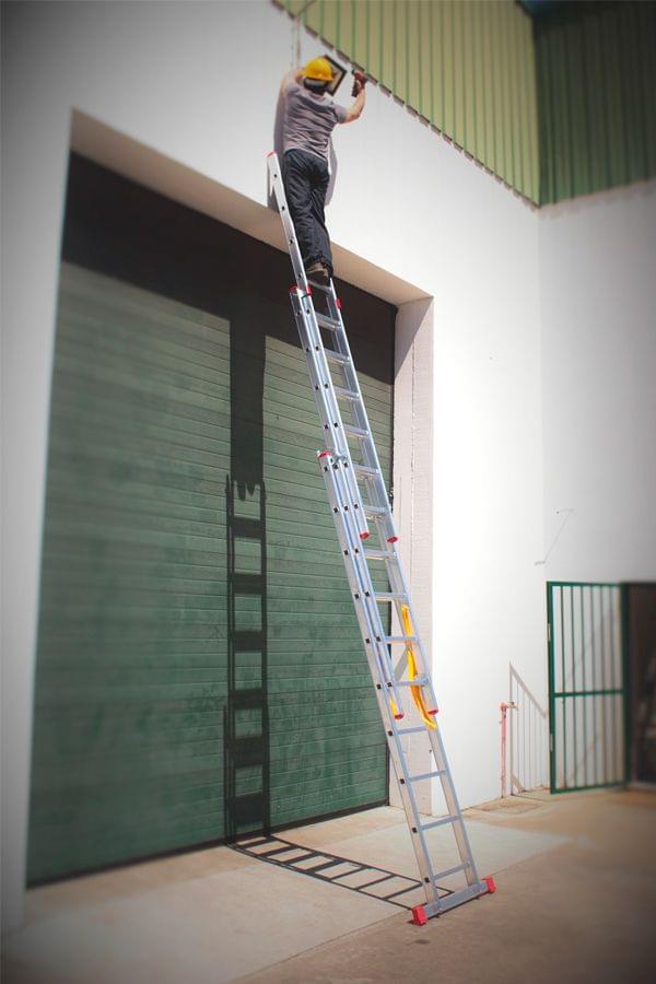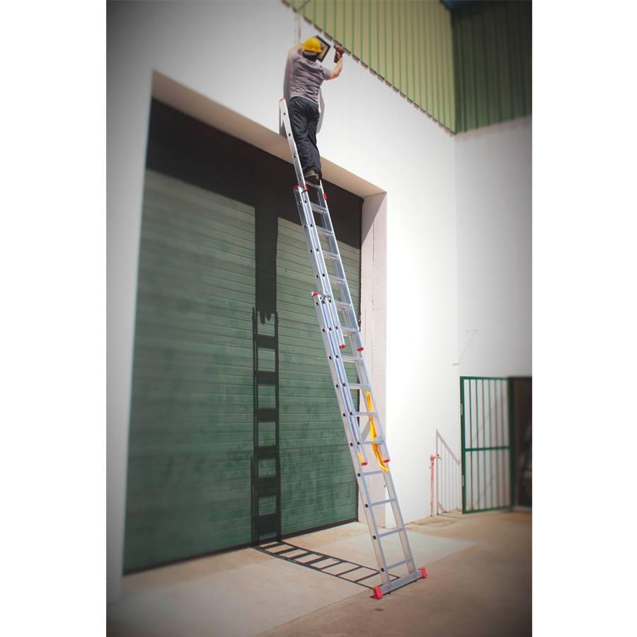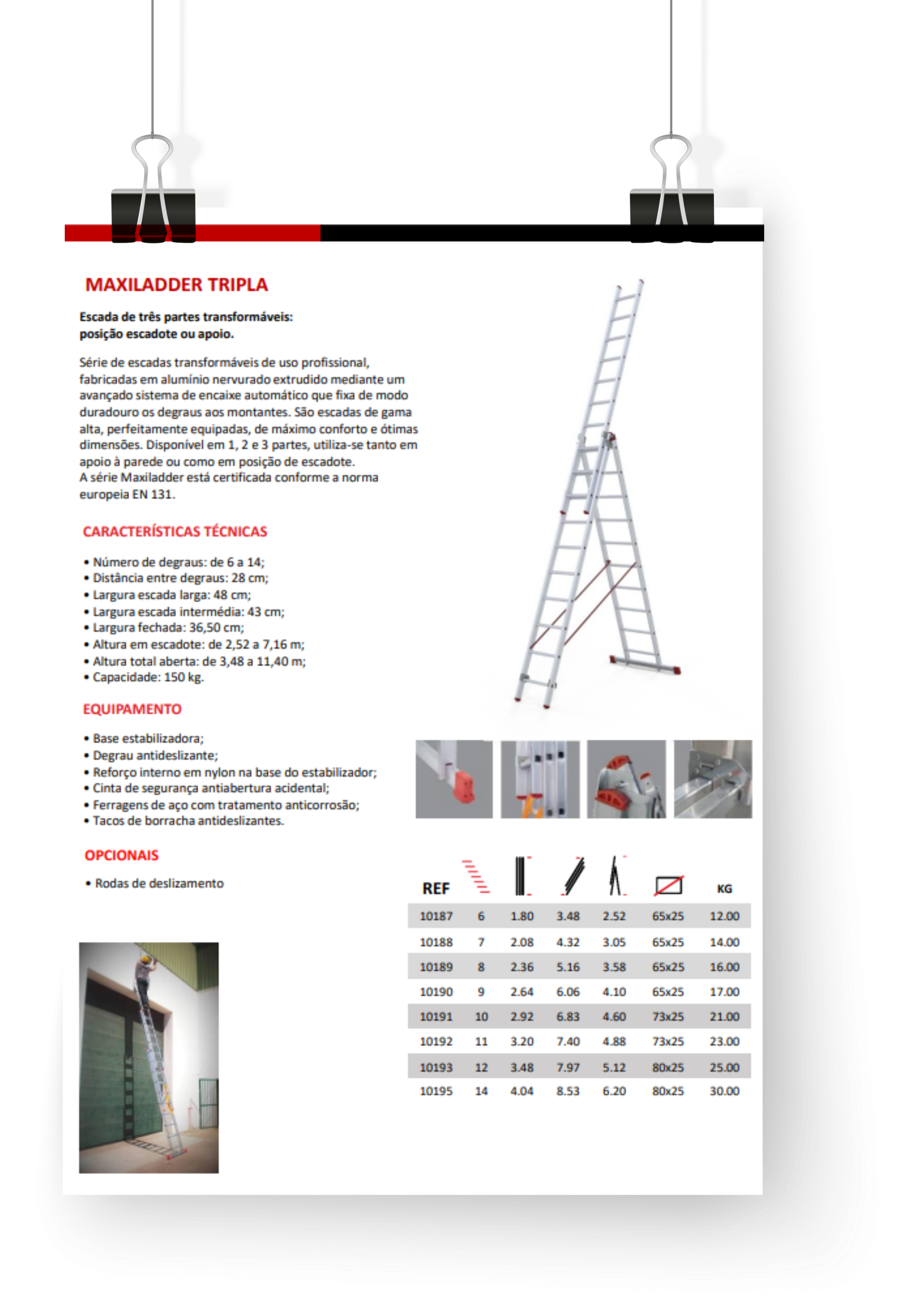 Série de escadas transformáveis de uso profissional, fabricadas em alumínio nervurado extrudido mediante um avançado sistema de encaixe automático que fixa de modo duradouro os degraus aos montantes. São escadas de gama alta, perfeitamente equipadas, de máximo conforto e ótimas dimensões. Disponível em 1, 2 e 3 partes, utiliza-se tanto em apoio à parede ou como em posição de escadote. A série Maxiladder está certificada conforme a norma europeia EN 131.