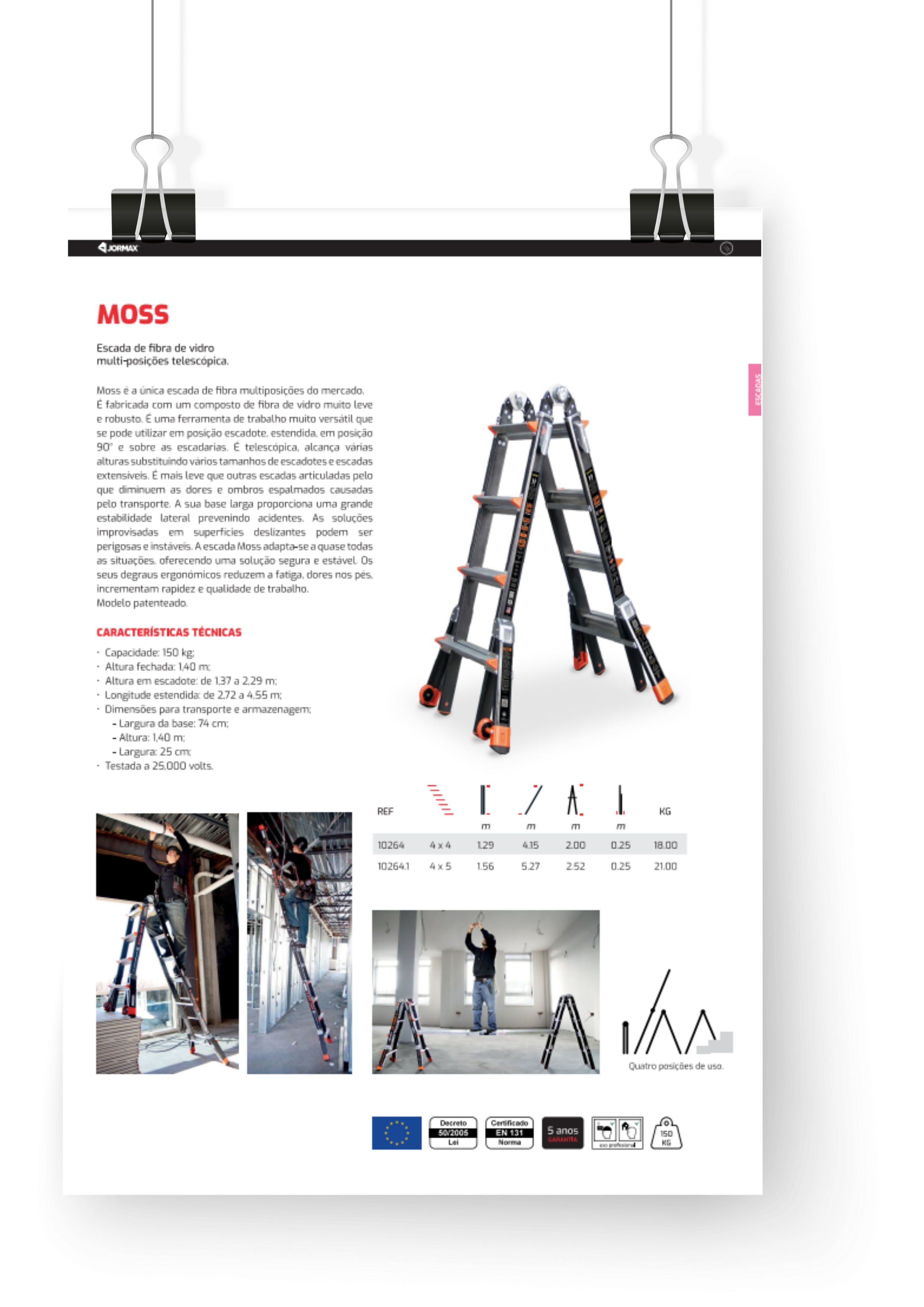Moss é a única escada de fibra multiposições do mercado. É fabricada com um composto de fibra de vidro muito leve e robusto. É uma ferramenta de trabalho muito versátil que se pode utilizar em posição escadote, estendida, em posição 90° e sobre as escadarias. É telescópica, alcança várias alturas substituindo vários tamanhos de escadotes e escadas extensíveis. É mais leve que outras escadas articuladas pelo que diminuem as dores e ombros espalmados causadas pelo transporte. A sua base larga proporciona uma grande estabilidade lateral prevenindo acidentes. As soluções improvisadas em superfícies deslizantes podem ser perigosas e instáveis. A escada Moss adapta-se a quase todas as situações, oferecendo uma solução segura e estável. Os seus degraus ergonómicos reduzem a fatiga, dores nos pés, incrementam rapidez e qualidade de trabalho. Modelo patenteado.
