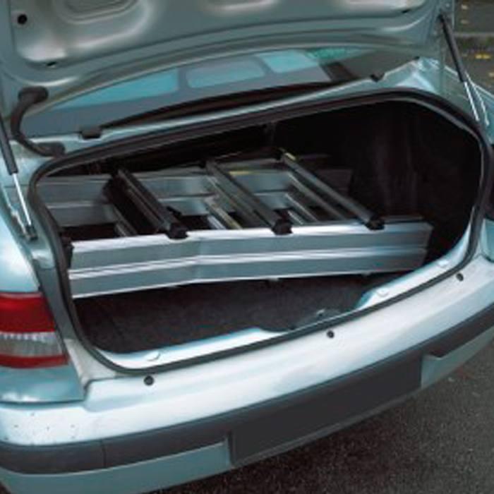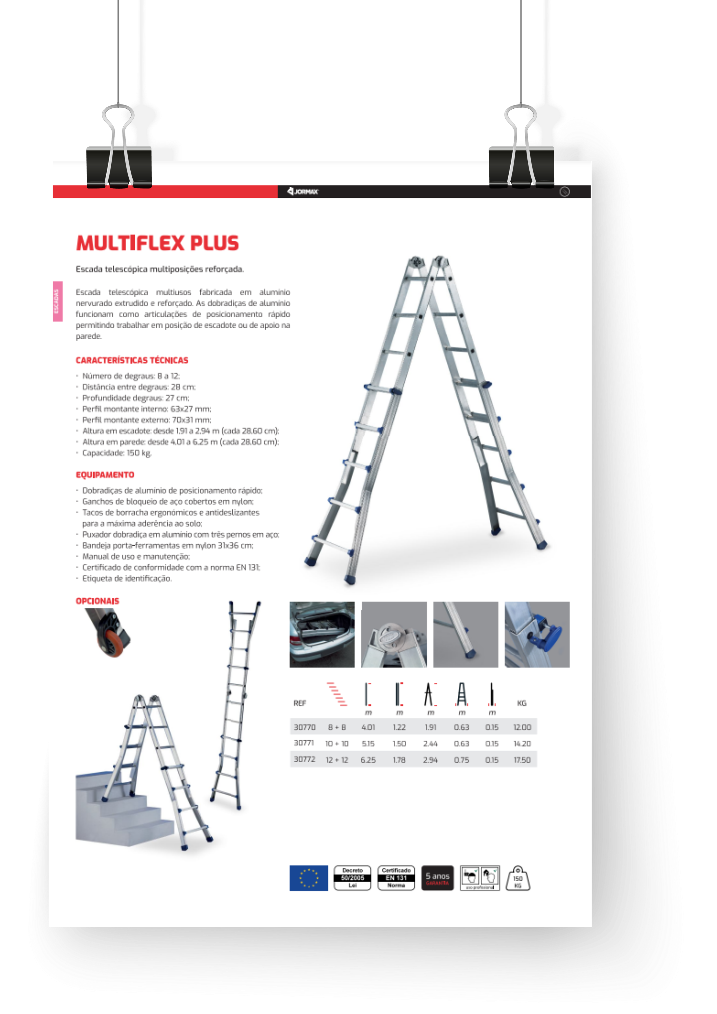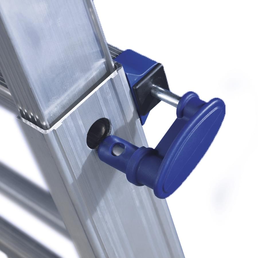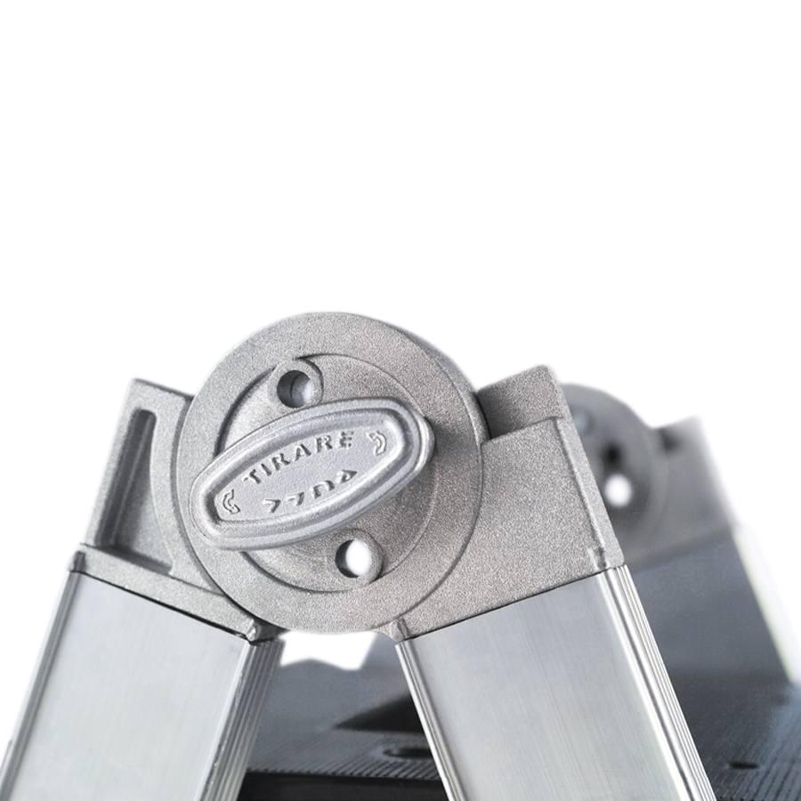 Escada telescópica multiusos fabricada em alumínio nervurado extrudido e reforçado. As dobradiças de alumínio funcionam como articulações de posicionamento rápido permitindo trabalhar em posição de escadote ou de apoio na parede.