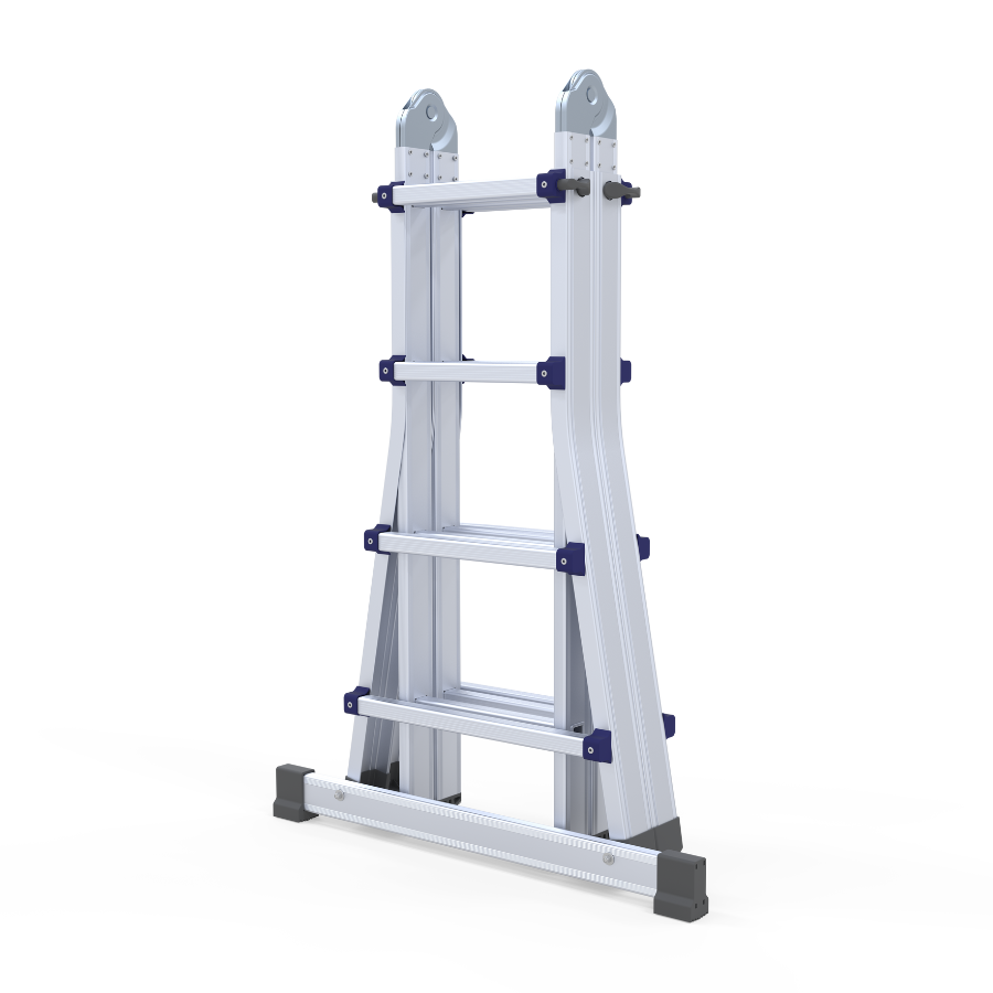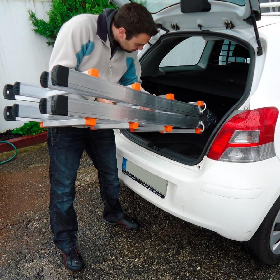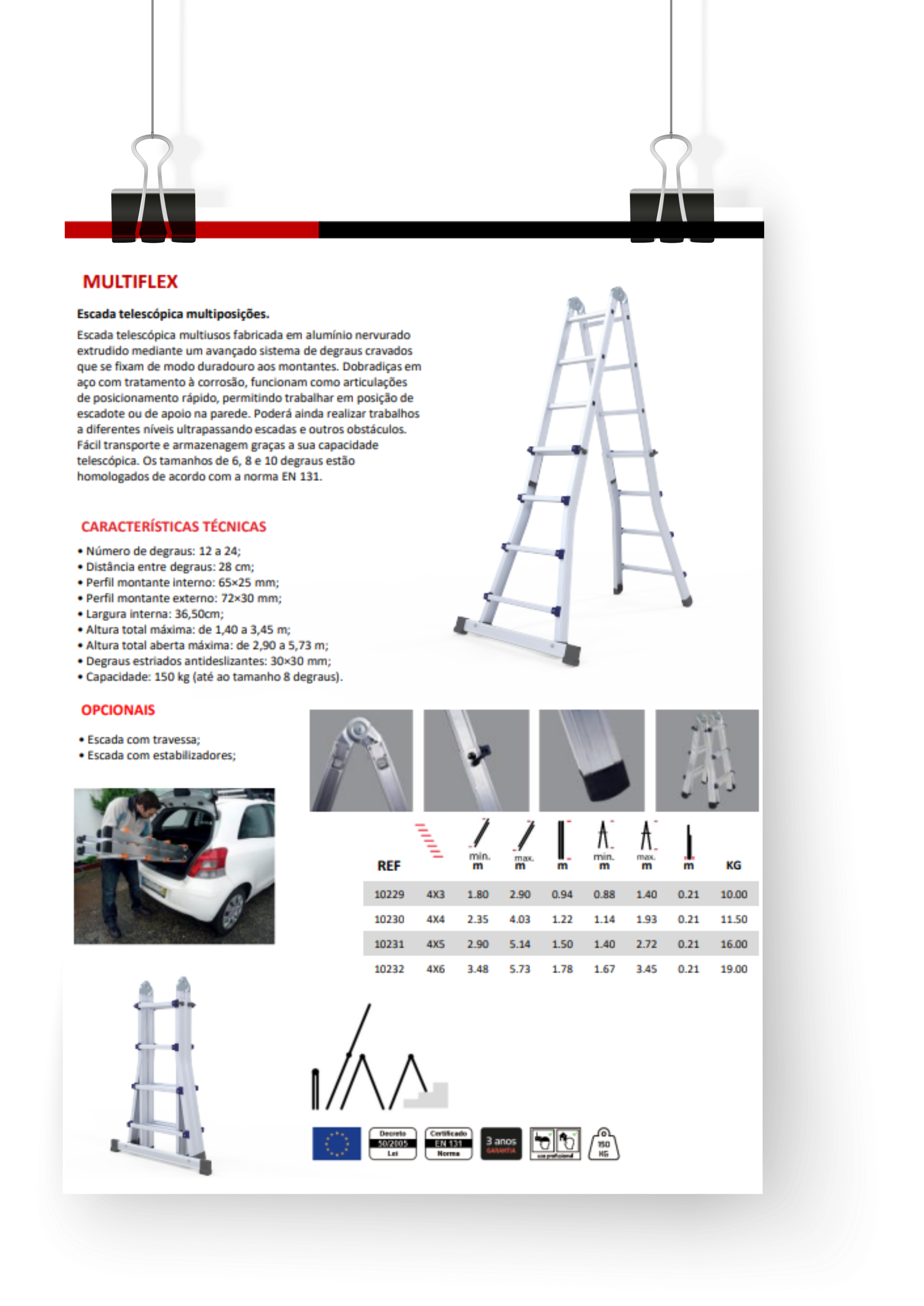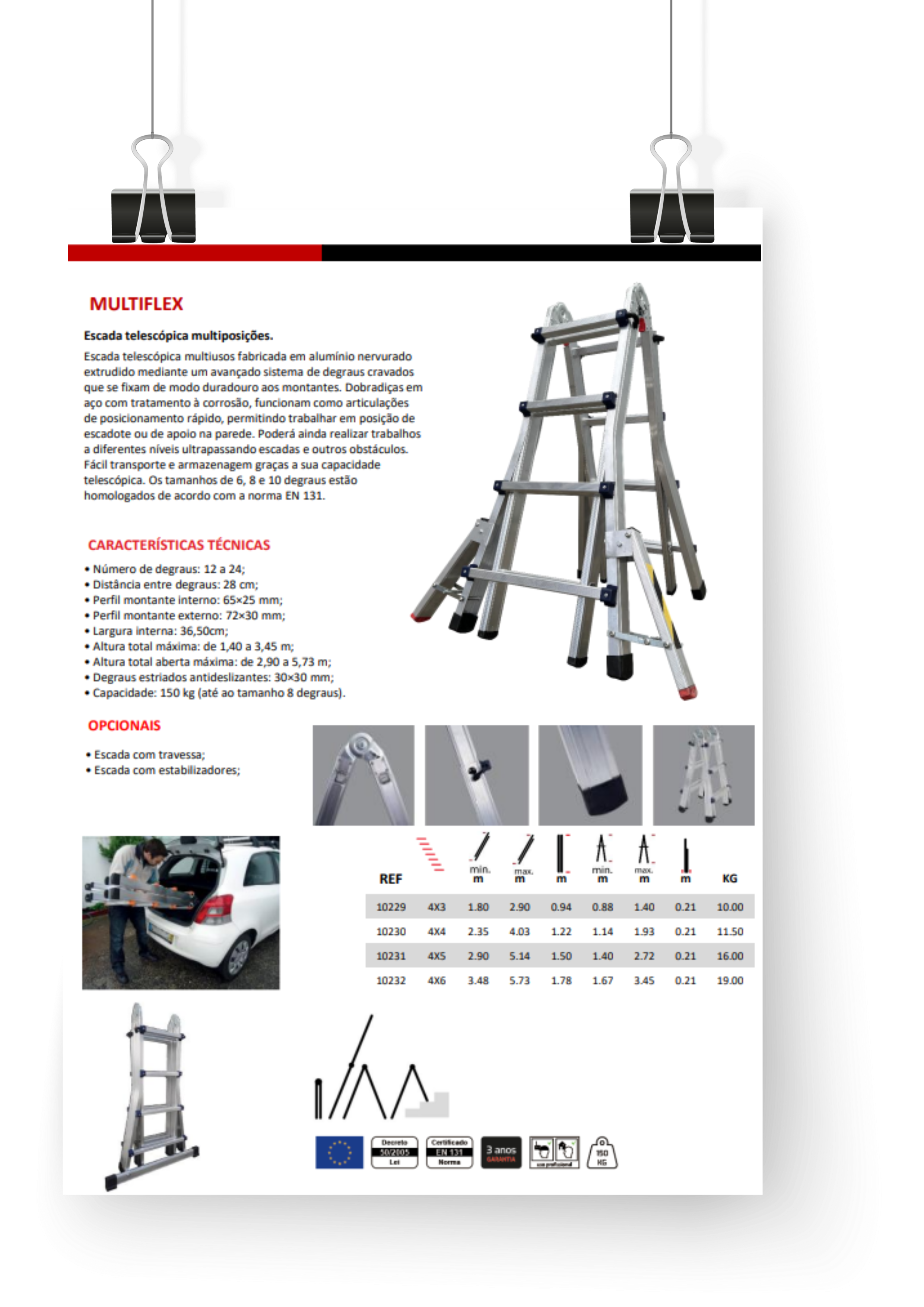 Escada telescópica multiusos fabricada em alumínio nervurado extrudido mediante um avançado sistema de degraus cravados que se fixam de modo duradouro aos montantes. Dobradiças em aço com tratamento à corrosão, funcionam como articulações de posicionamento rápido, permitindo trabalhar em posição de escadote ou de apoio na parede. Poderá ainda realizar trabalhos a diferentes níveis ultrapassando escadas e outros obstáculos. Fácil transporte e armazenagem graças a sua capacidade telescópica. Os tamanhos de 6, 8 e 10 degraus estão homologados de acordo com a norma EN 131. A escada é fornecida sem travessa e sem estabilizadores em conformidade com o DL 50/2005, para cumprimento da norma EN 131 a escada deverá estar devidamente equipada com travessa ou estabilizadores.