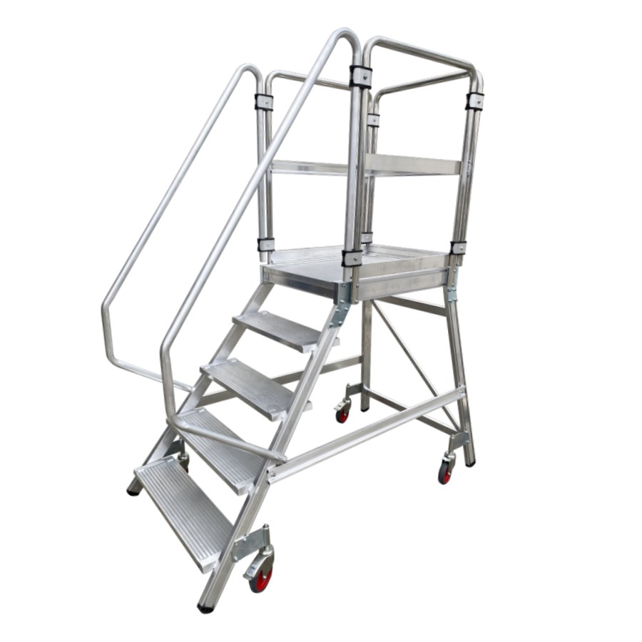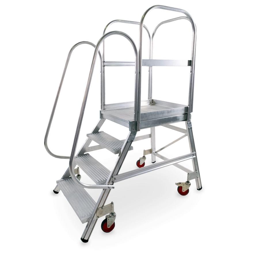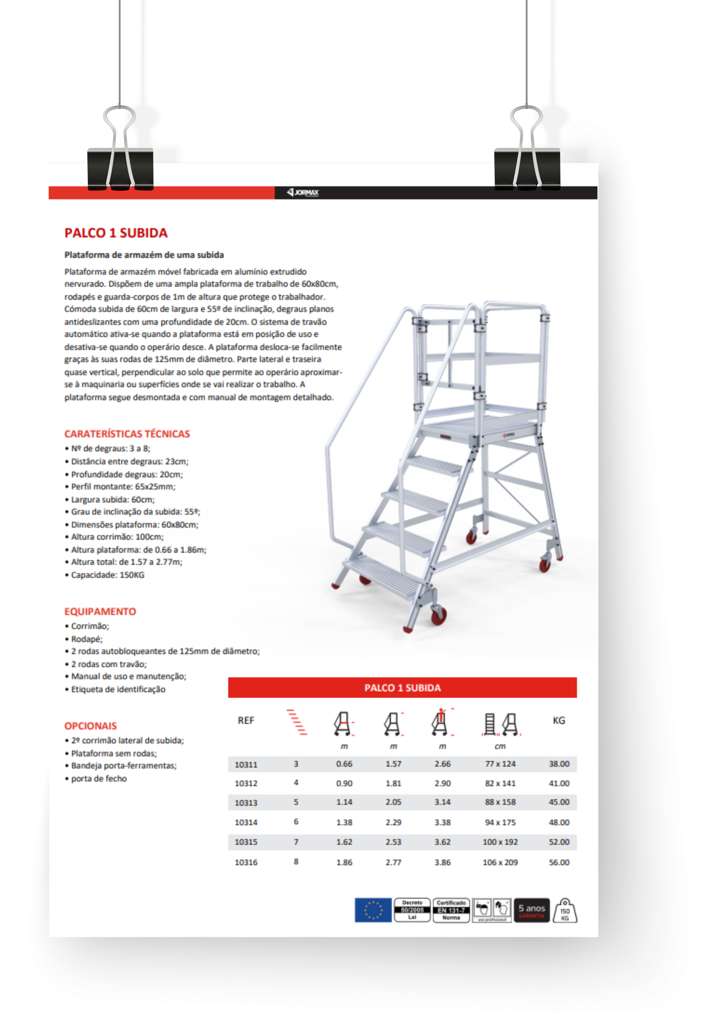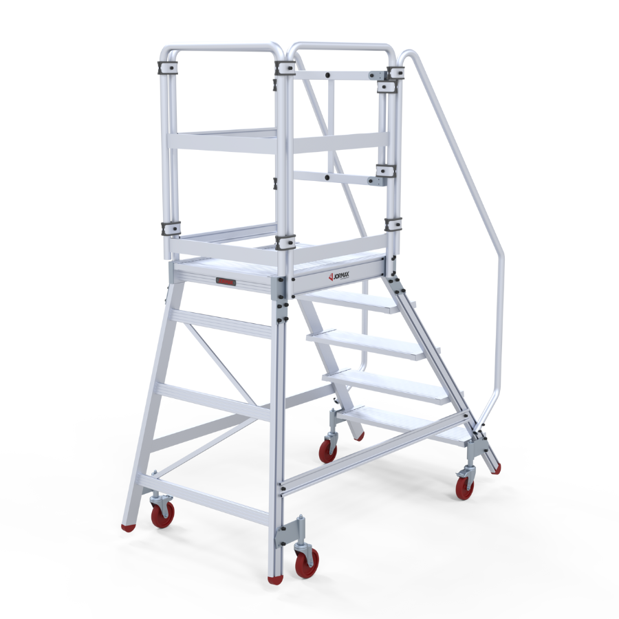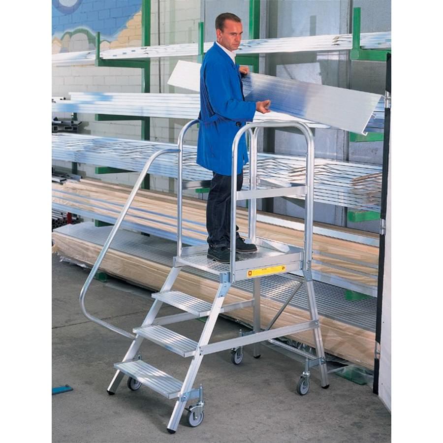 Plataforma de armazém móvel fabricada em alumínio extrudido nervurado. Dispõem de uma ampla plataforma de trabalho de 60×80 cm, rodapés e guarda-corpos de 1 m de altura que protege o trabalhador. Cómoda subida de 60 cm de largura e 55° de inclinação, degraus planos antideslizantes com uma profundidade de 20 cm. O sistema de travão automático ativa-se quando a plataforma está em posição uso e desativa-se quando o operário desce. A plataforma desloca-se facilmente graças às suas rodas de 125 mm de diâmetro. Parte lateral e traseira quase vertical, perpendicular ao solo que permite ao operário aproximar-se à maquinaria ou superfícies onde se vai realizar o trabalho. A plataforma segue desmontada e com manual de montagem detalhado.