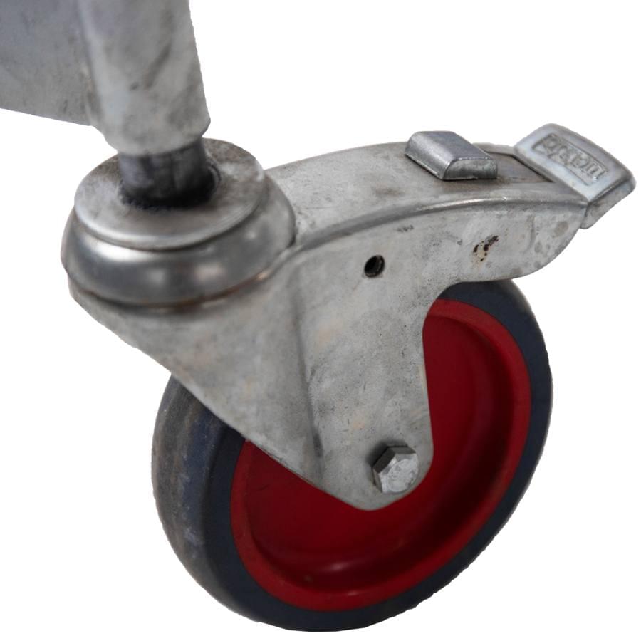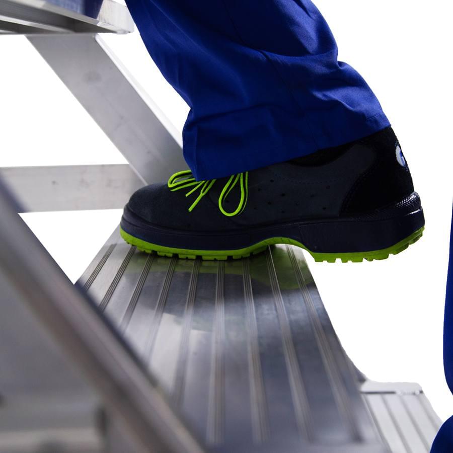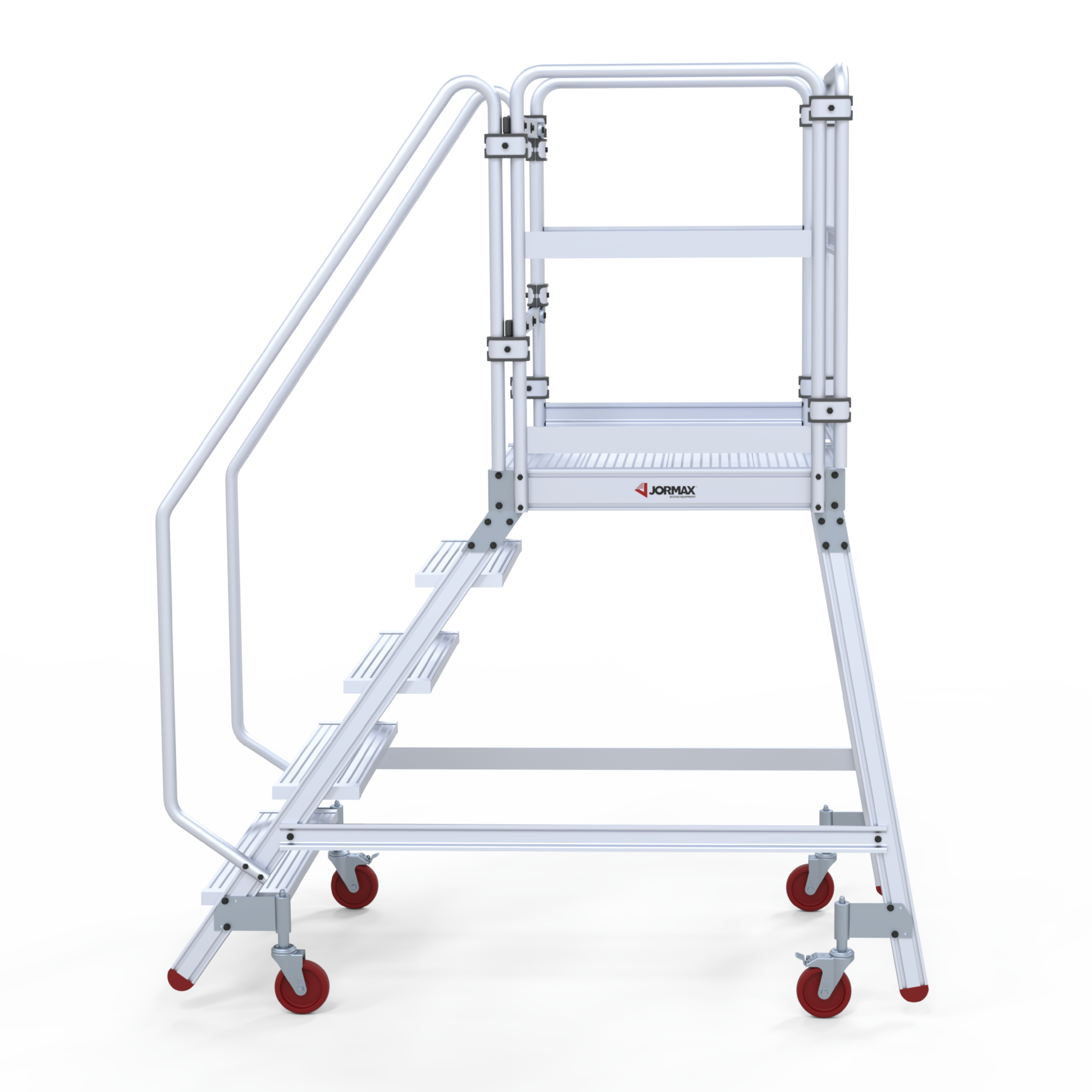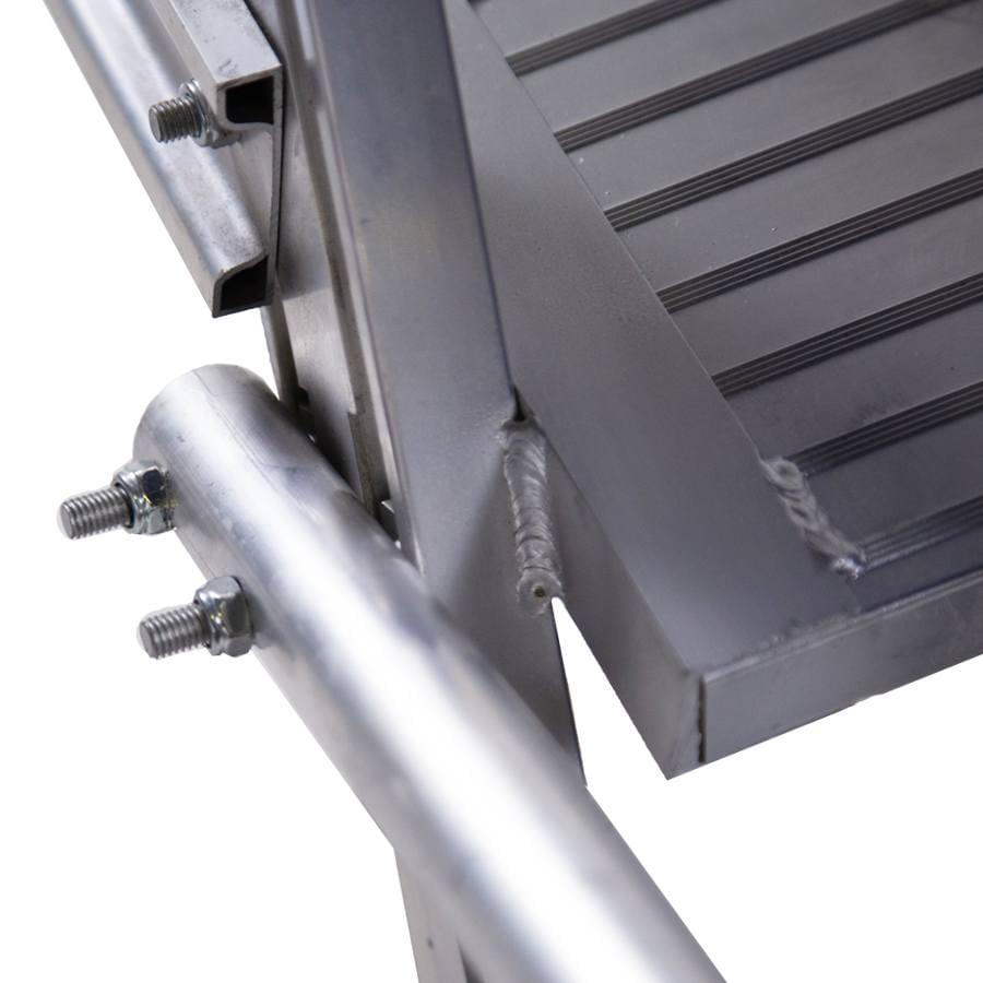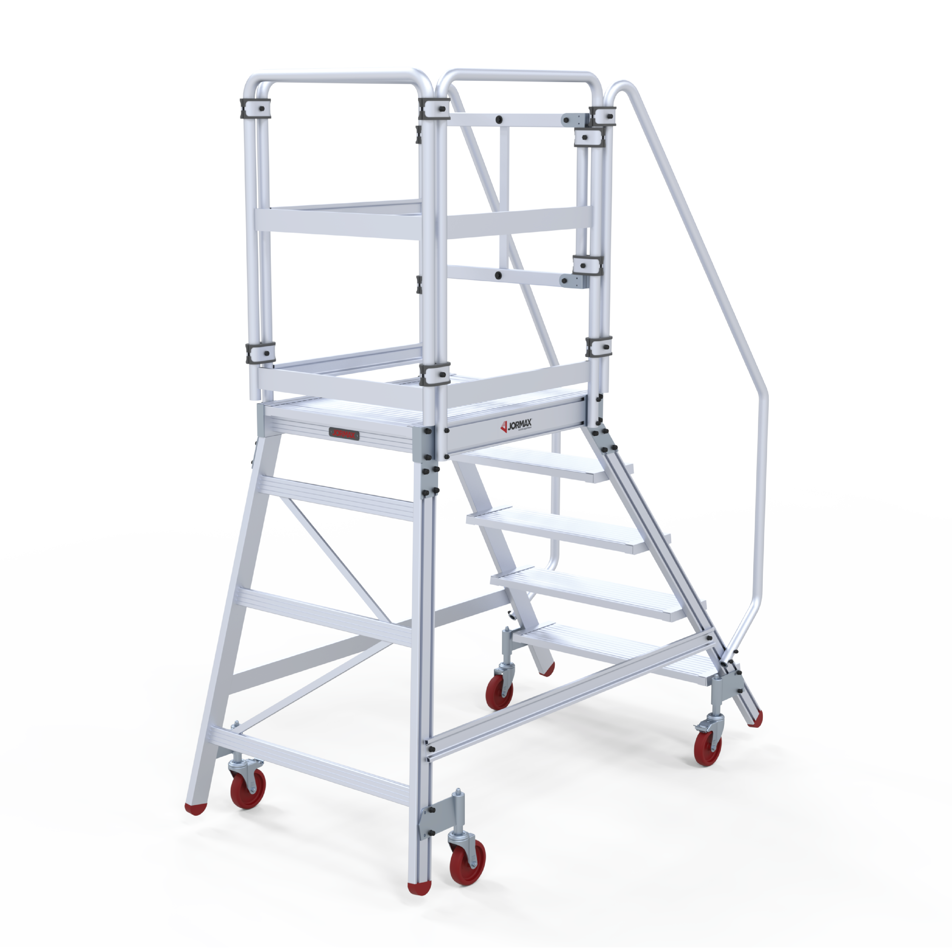 Plataforma de armazém móvel fabricada em alumínio extrudido nervurado. Dispõem de uma ampla plataforma de trabalho de 60×80 cm, rodapés e guarda-corpos de 1 m de altura que protege o trabalhador. Cómoda subida de 60 cm de largura e 55° de inclinação, degraus planos antideslizantes com uma profundidade de 20 cm. O sistema de travão automático ativa-se quando a plataforma está em posição uso e desativa-se quando o operário desce. A plataforma desloca-se facilmente graças às suas rodas de 125 mm de diâmetro. Parte lateral e traseira quase vertical, perpendicular ao solo que permite ao operário aproximar-se à maquinaria ou superfícies onde se vai realizar o trabalho. A plataforma segue desmontada e com manual de montagem detalhado.
