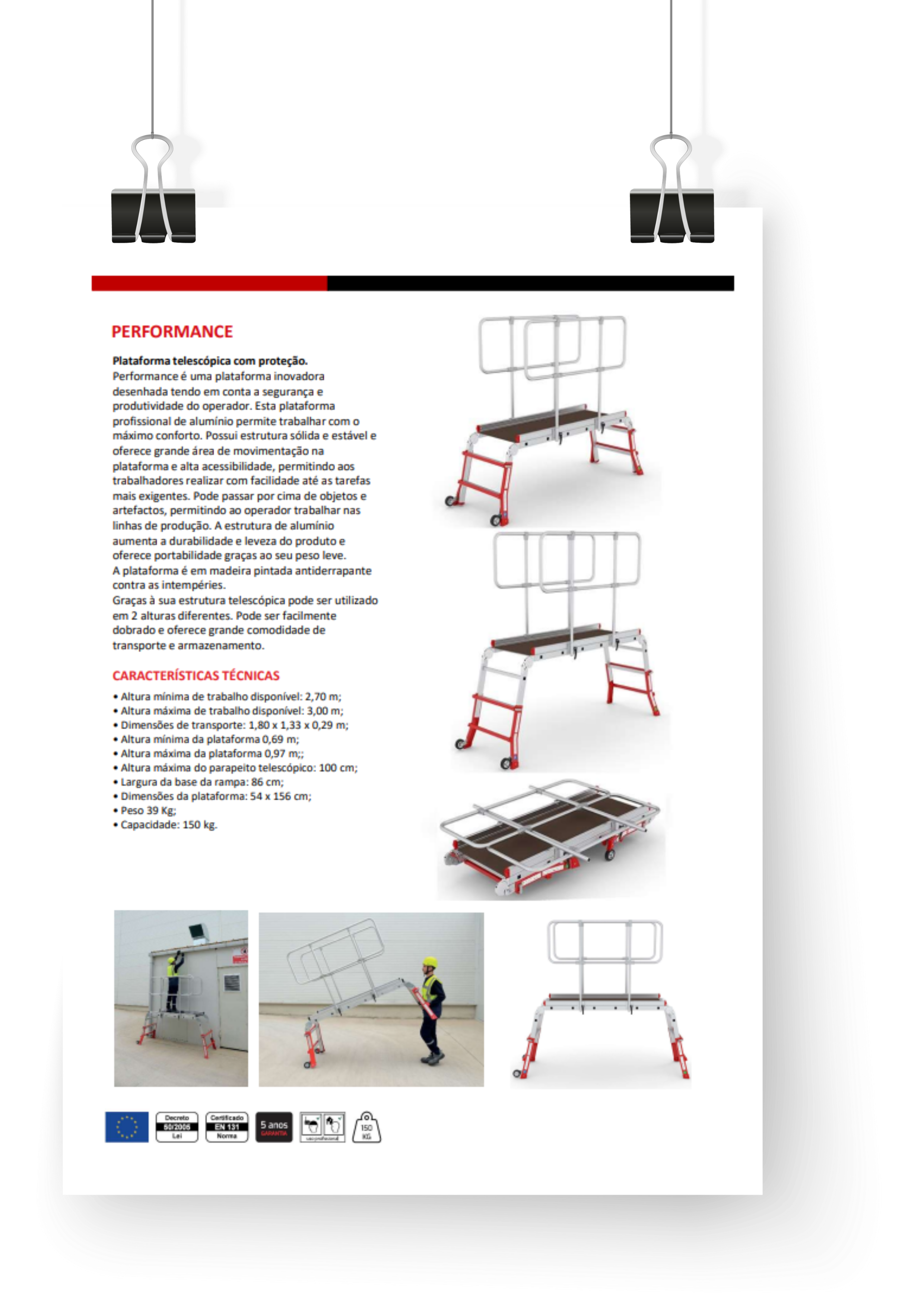 Performance é uma plataforma inovadora desenhada tendo em conta a segurança e produtividade do operador. Esta plataforma profissional de alumínio permite trabalhar com o máximo conforto. Possui estrutura sólida e estável e oferece grande área de movimentação na plataforma e alta acessibilidade, permitindo aos trabalhadores realizar com facilidade até as tarefas mais exigentes. Pode passar por cima de objetos e artefactos, permitindo ao operador trabalhar nas linhas de produção. A estrutura de alumínio aumenta a durabilidade e leveza do produto e oferece portabilidade graças ao seu peso leve.