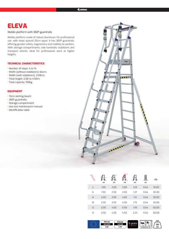 Plataforma móvel fabricada em robusto alumínio, de uso profissional, com degraus distanciados por 25cm. Apresenta guarda-corpos a 360º, oferecendo maior segurança, ergonomia e mobilidade aos trabalhadores. Com porta-objetos, corrimões laterais, estabilizadores e rodas de transporte. Ideal para trabalhos profissionais a alturas mais elevadas.