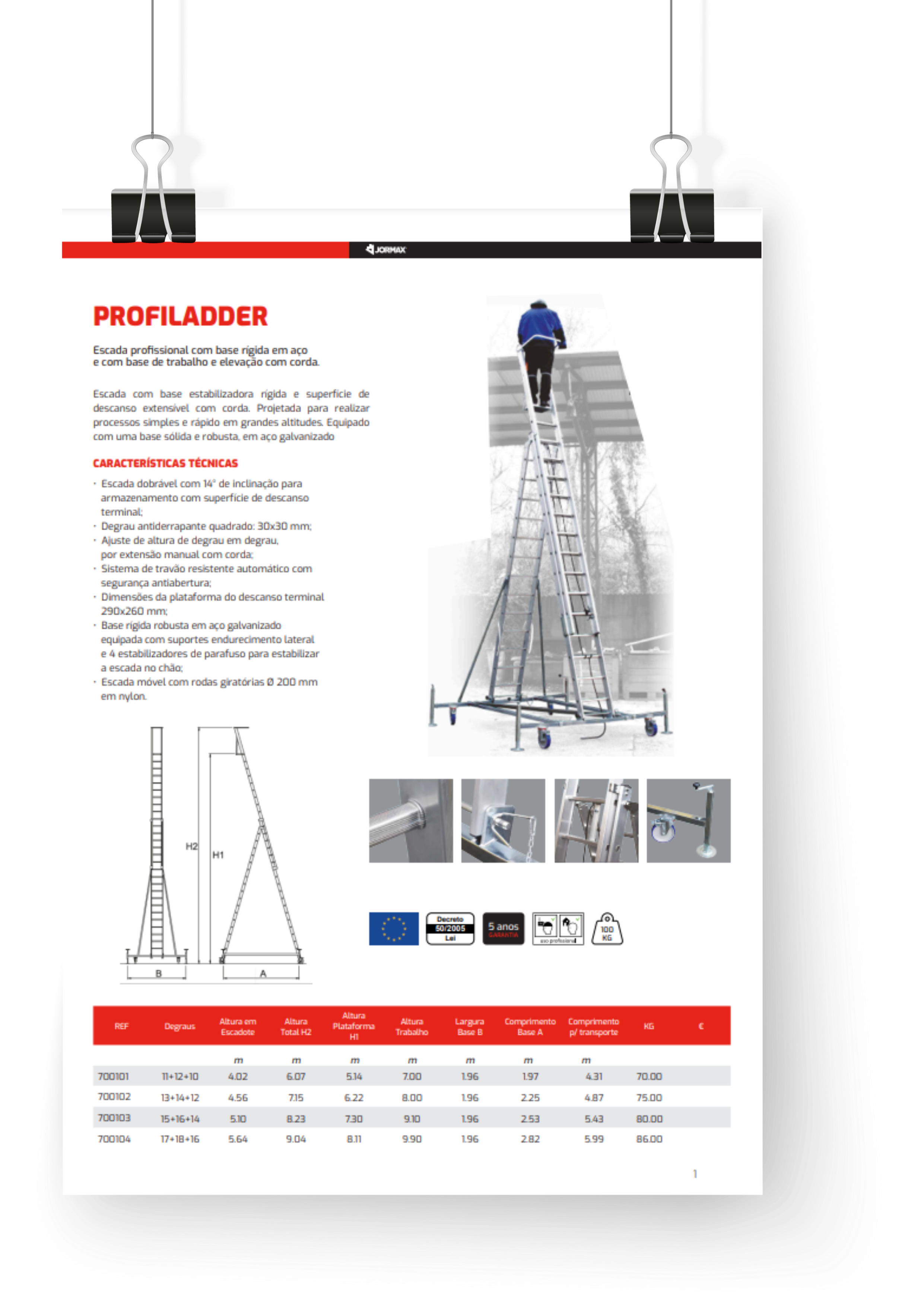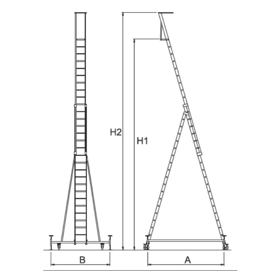 Escada com base estabilizadora rígida e superfície de descanso extensível com corda. Projetada para realizar processos simples e rápido em grandes altitudes. Equipado com uma base sólida e robusta, em aço galvanizado.