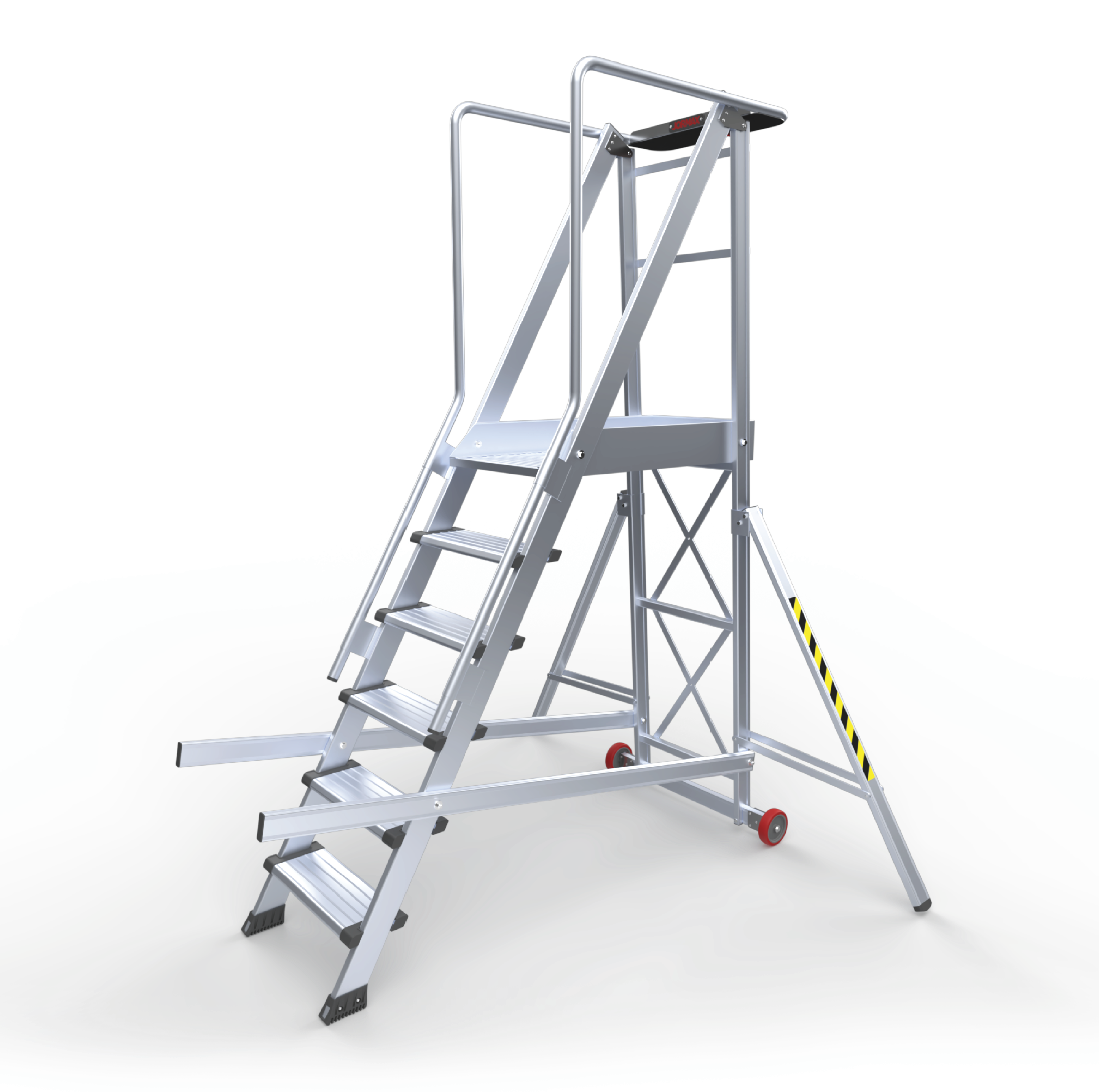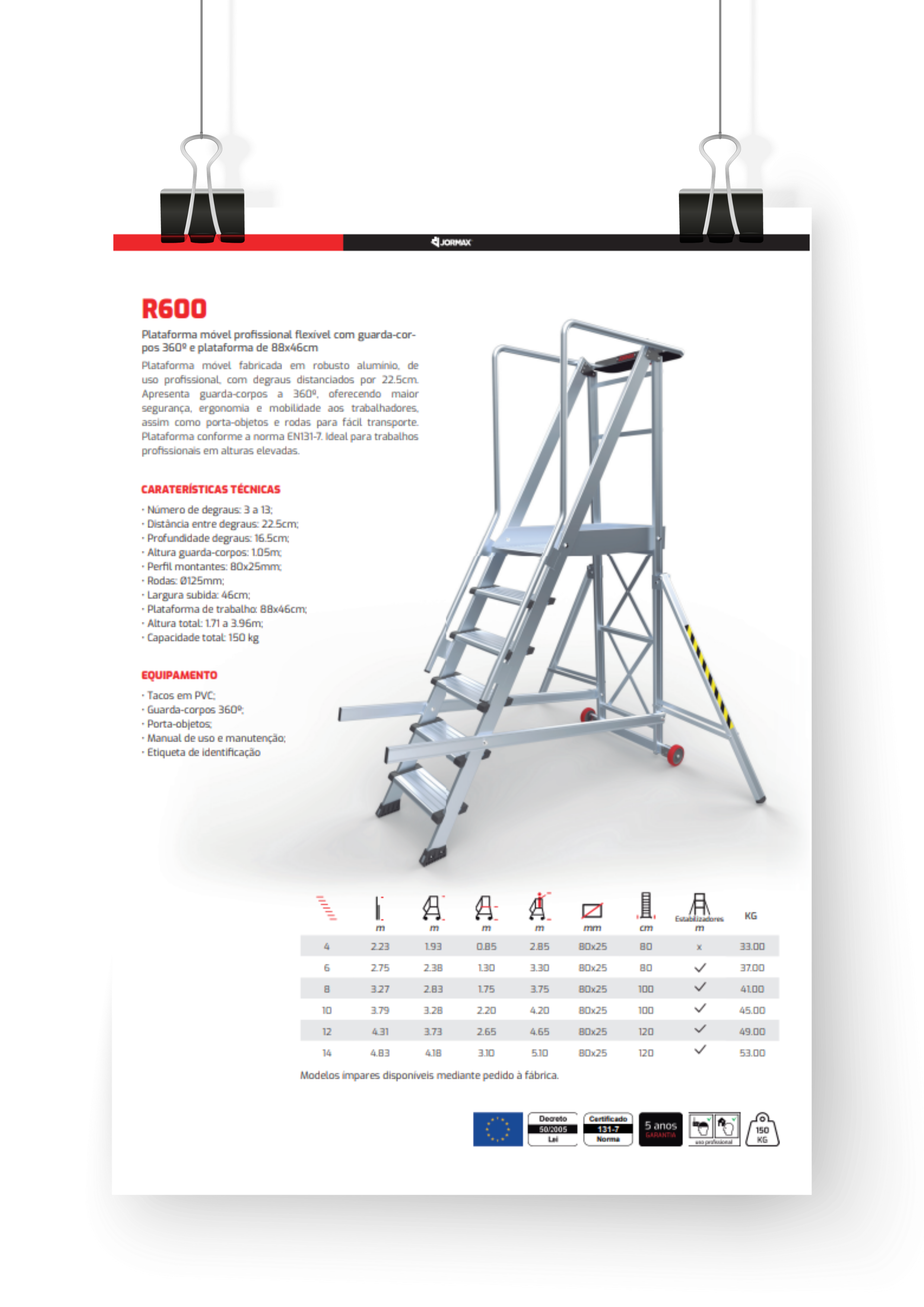 Plataforma móvel fabricada em robusto alumínio, de uso profissional, com degraus distanciados por 22.5cm. Apresenta guarda-corpos a 360º, oferecendo maior segurança, ergonomia e mobilidade aos trabalhadores, assim como porta-objetos e rodas para fácil transporte. Plataforma conforme a norma EN131-7. Ideal para trabalhos profissionais em alturas elevadas.