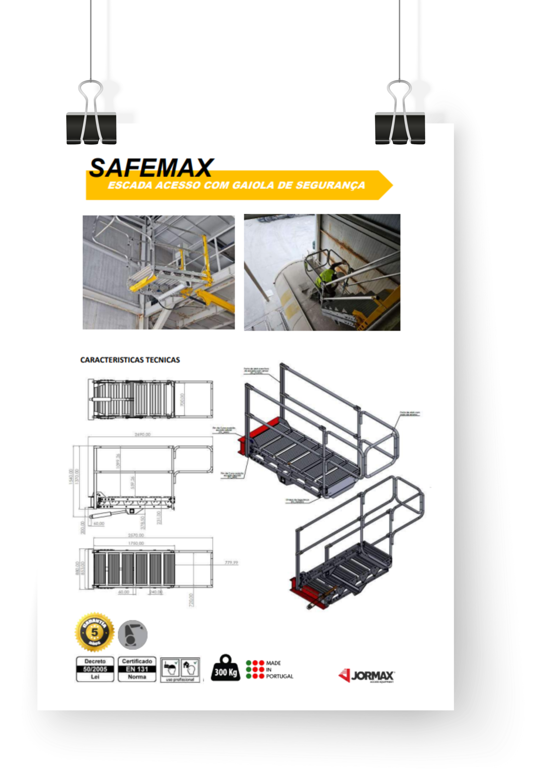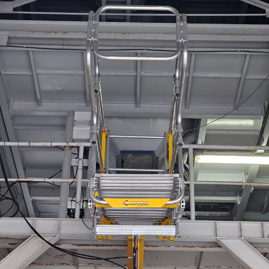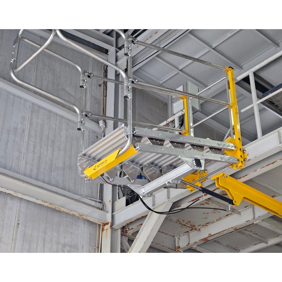 SAFEMAX é versátil e personalizáveis apresentam escadas dobráveis com uma gaiolas de segurança completamente automática, o sistema é acionado por um grupo hidráulico com paragem automáticas através de sensores de aproximação, construída em alumínio de alta resistência é equipada com degraus de 240mm e com guardas dobráveis de 40mm.