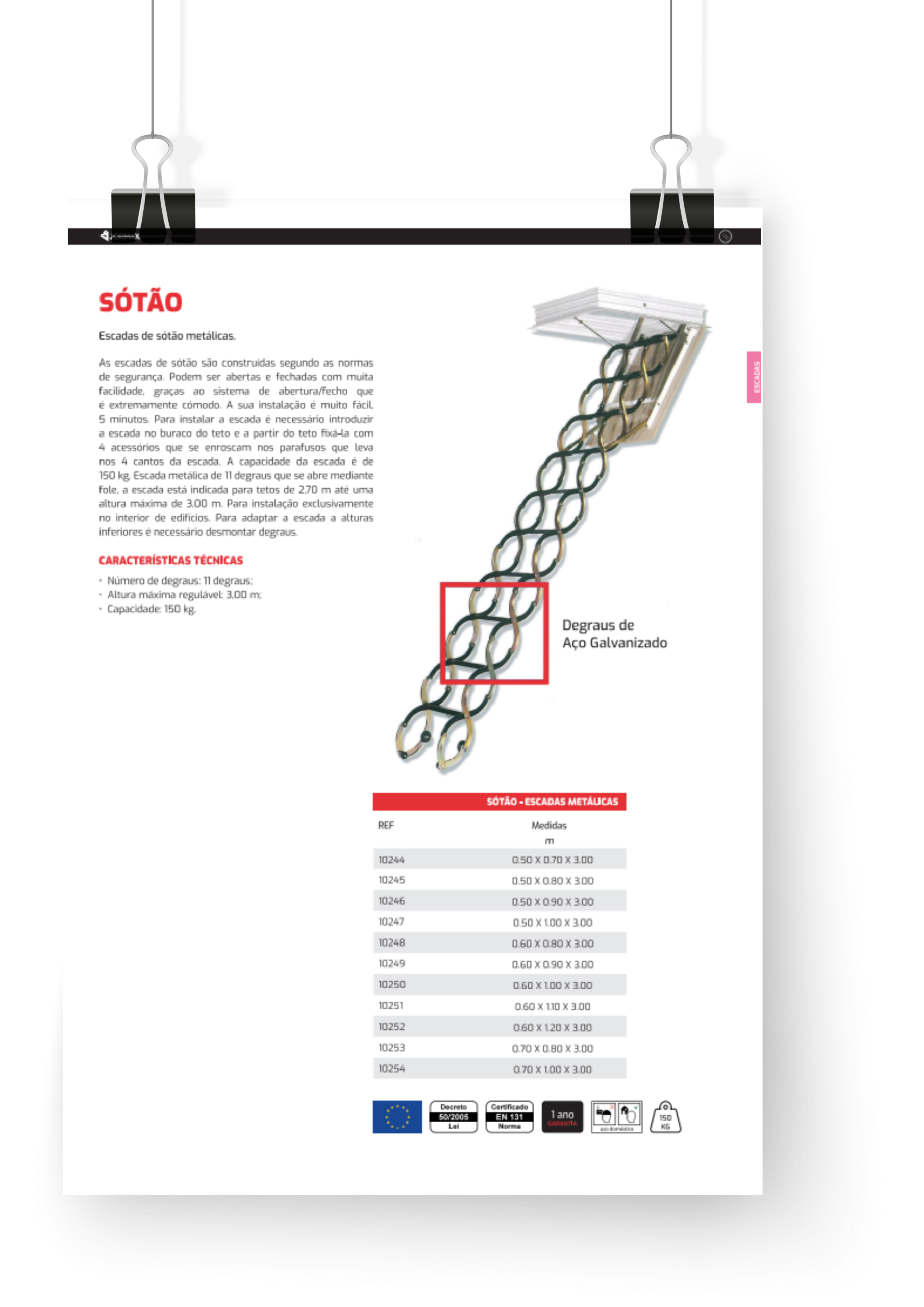 As escadas de sótão são construídas segundo as normas de segurança. Podem ser abertas e fechadas com muita facilidade, graças ao sistema de abertura/fecho que é extremamente cómodo. A sua instalação é muito fácil, 5 minutos. Para instalar a escada é necessário introduzir a escada no buraco do teto e a partir do teto fixá-la com 4 acessórios que se enroscam nos parafusos que leva nos 4 cantos da escada. A capacidade da escada é de 150 kg. Escada metálica de 11 degraus que se abre mediante fole, a escada está indicada para tetos de 2,70 m até uma altura máxima de 3,00 m. Para instalação exclusivamente no interior de edifícios. Para adaptar a escada a alturas inferiores é necessário desmontar degraus.