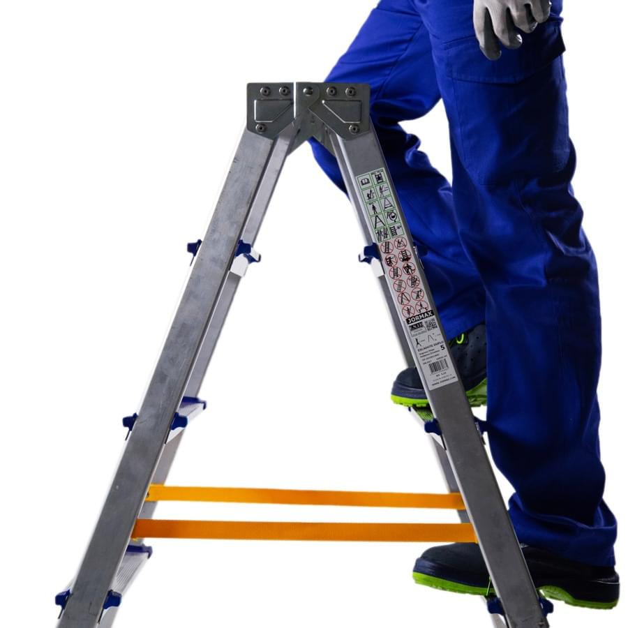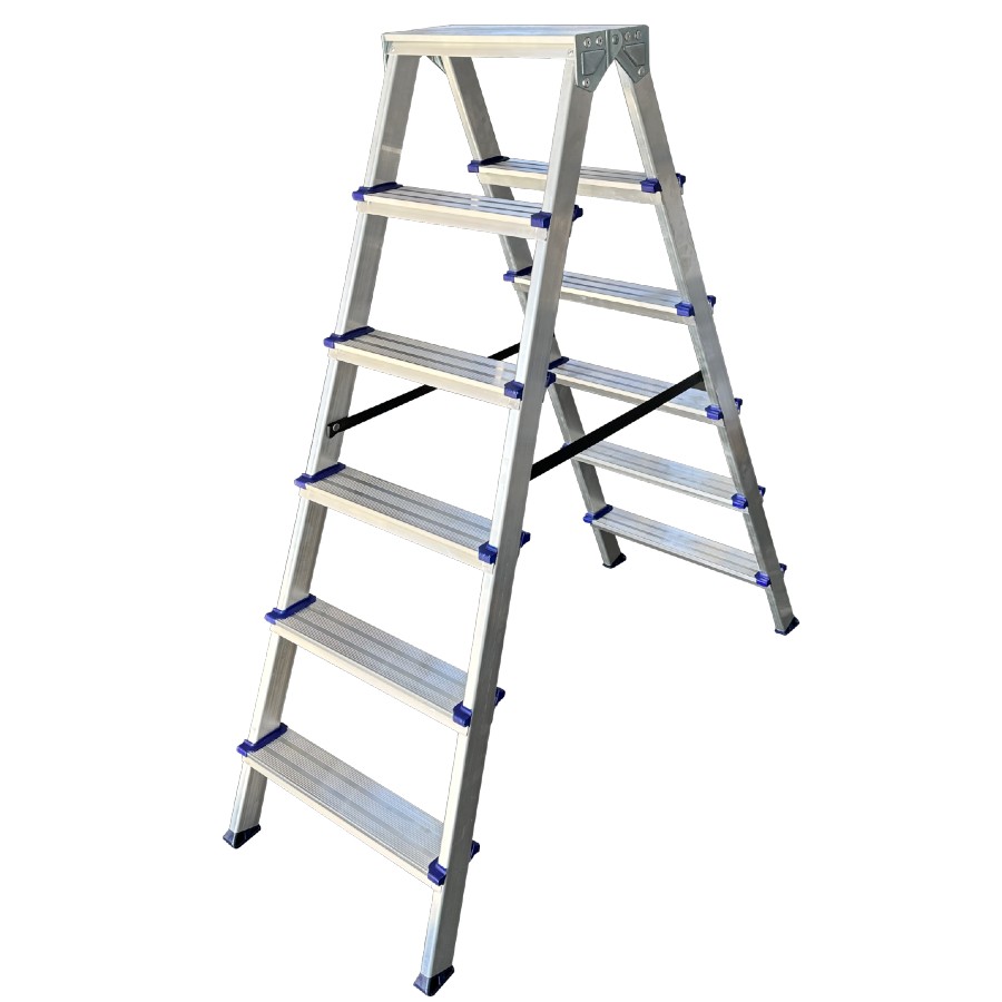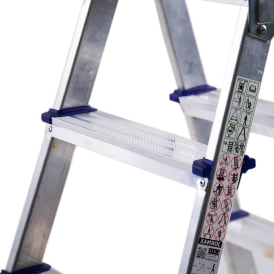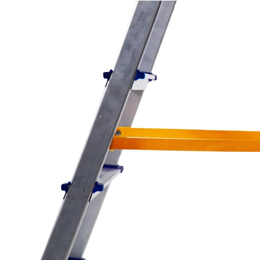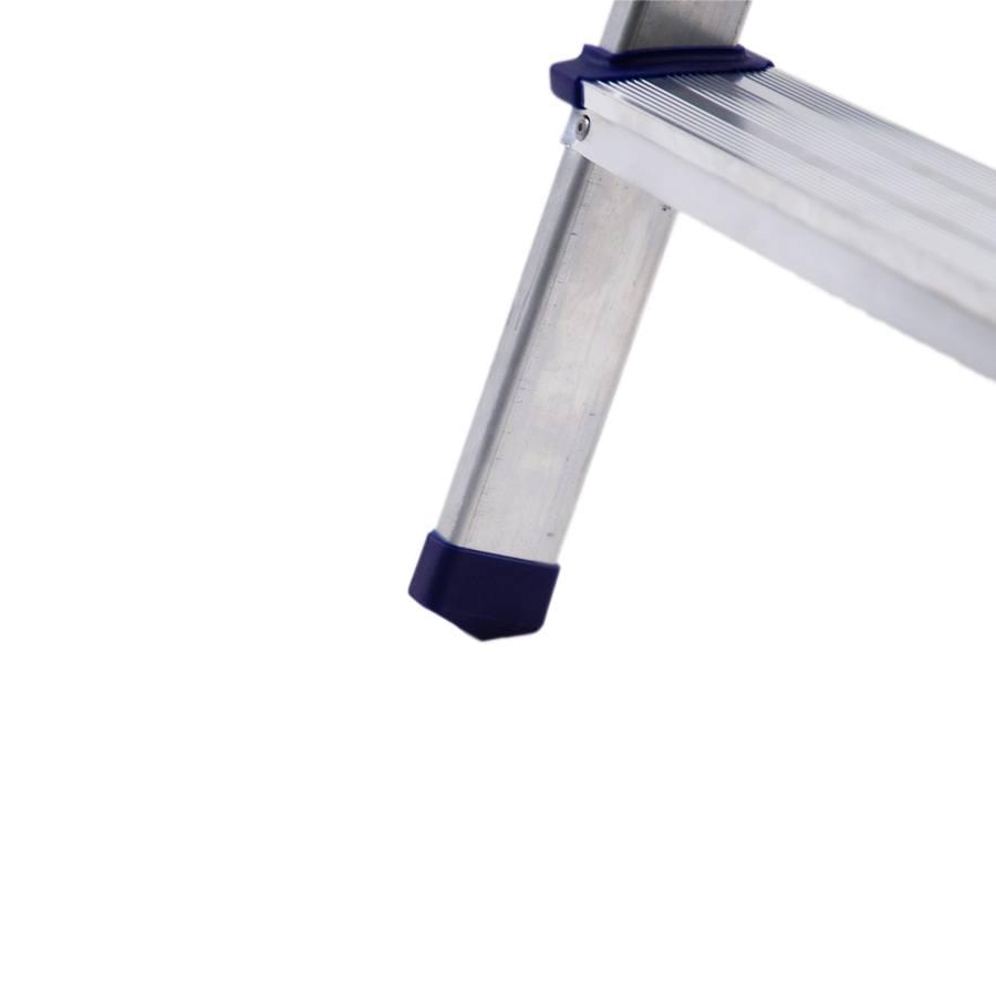 Escadote de alumínio com degrau largo e uma subida provida de plataforma e guarda-corpos. Está construído com degraus de alumínio rebitados aos montantes, obtendo uma rampa de subida resistente e estável. A abertura acidental é impedida pelas cintas de segurança. Fabricado segundo a norma europeia EN 131