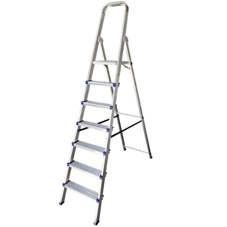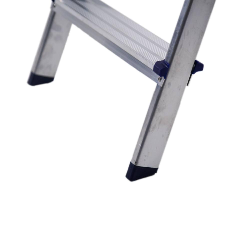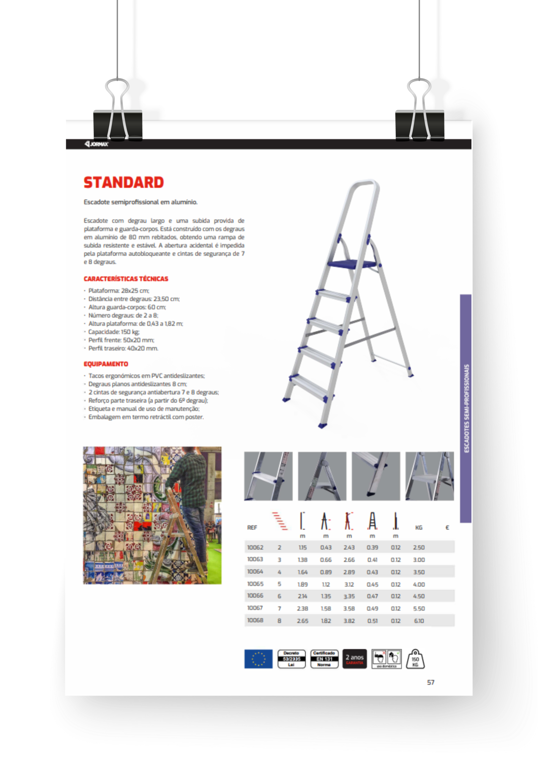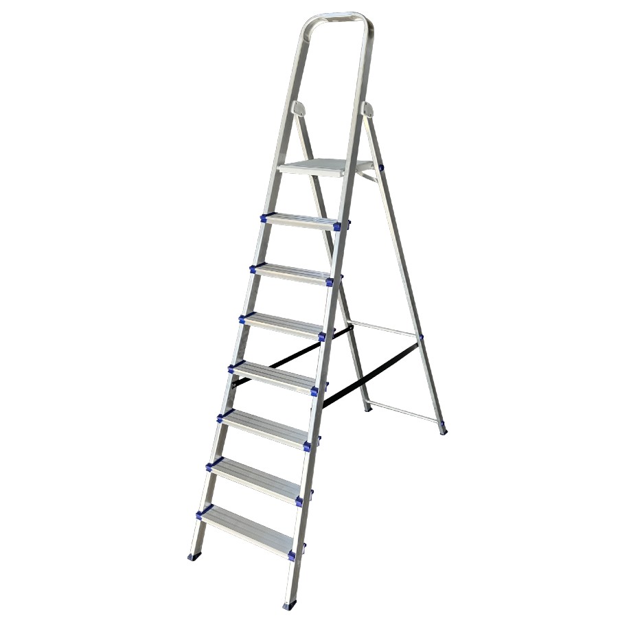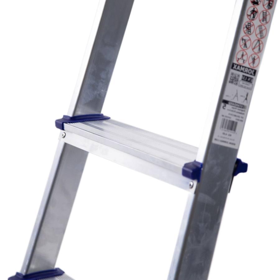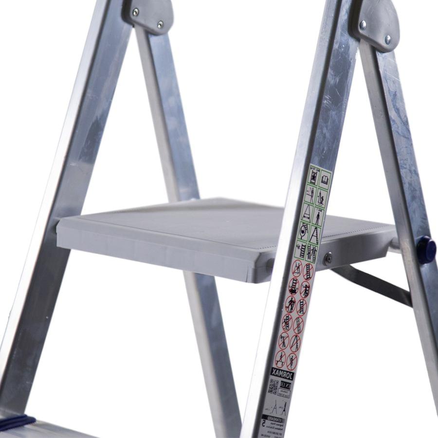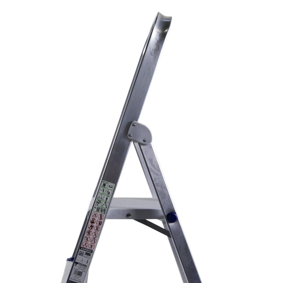 Escadote com degrau largo e uma subida provida de plataforma e guarda-corpos. Está construído com os degraus em alumínio de 80 mm rebitados, obtendo uma rampa de subida resistente e estável. A abertura acidental é impedida pela plataforma autobloqueante e cintas de segurança de 7 e 8 degraus.