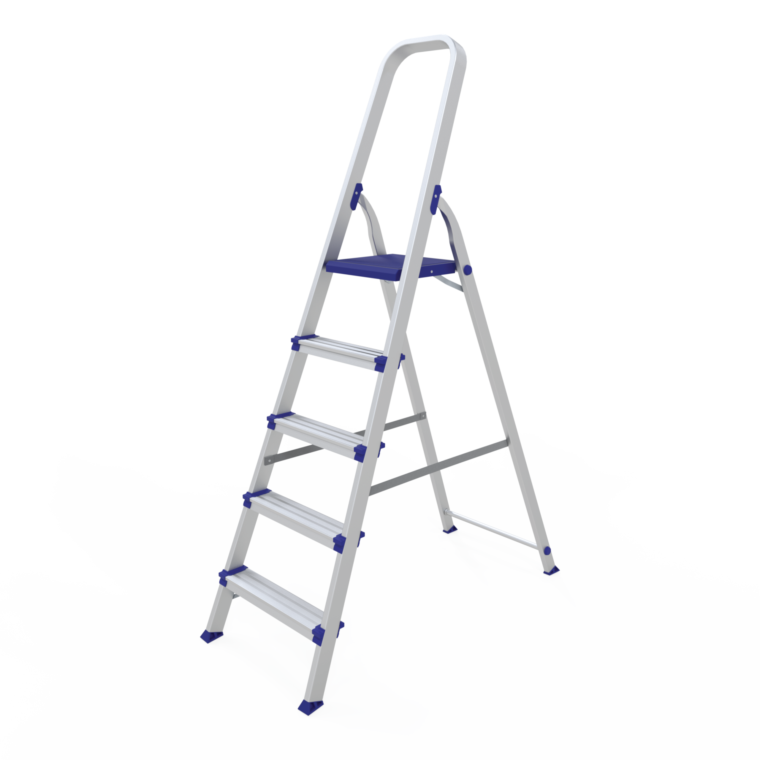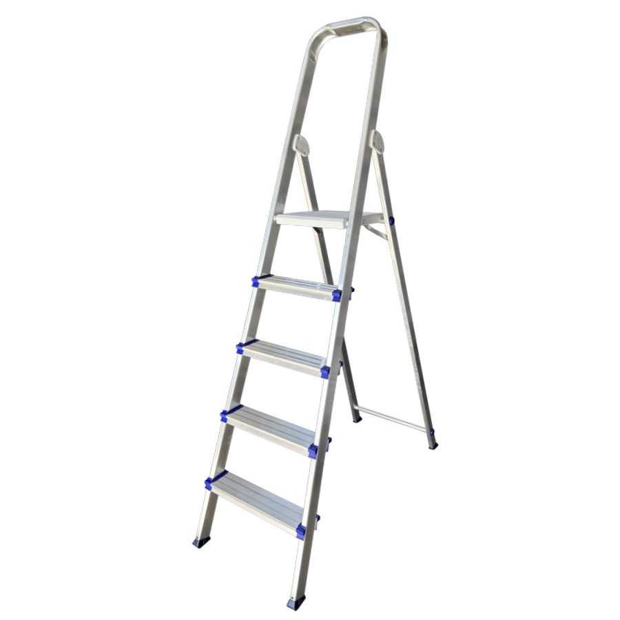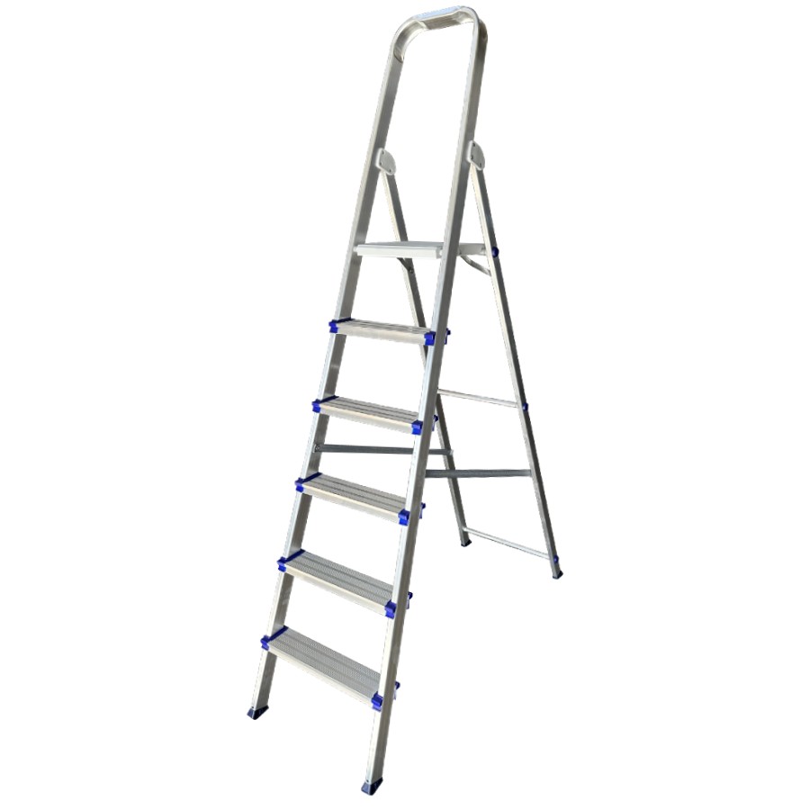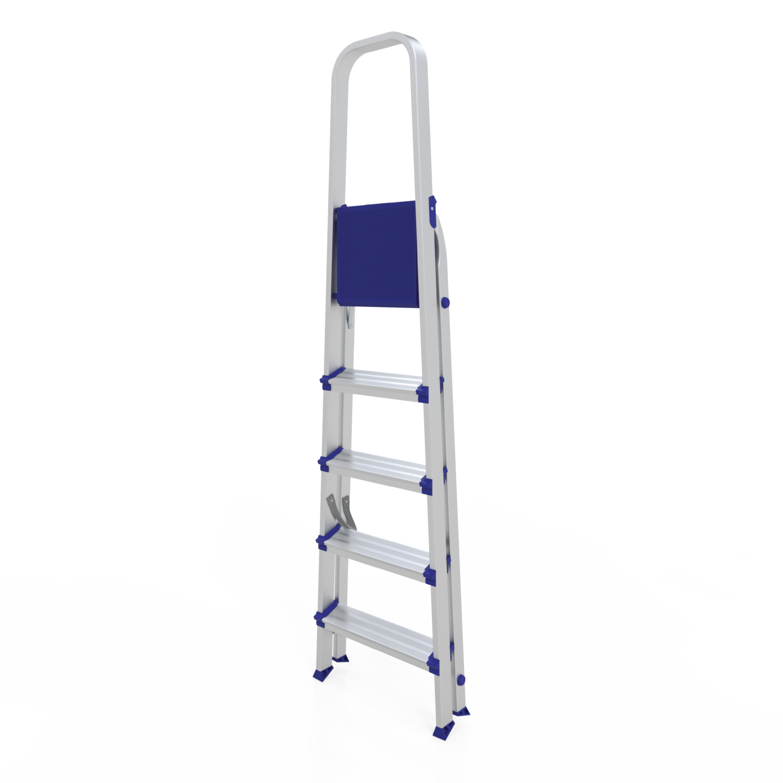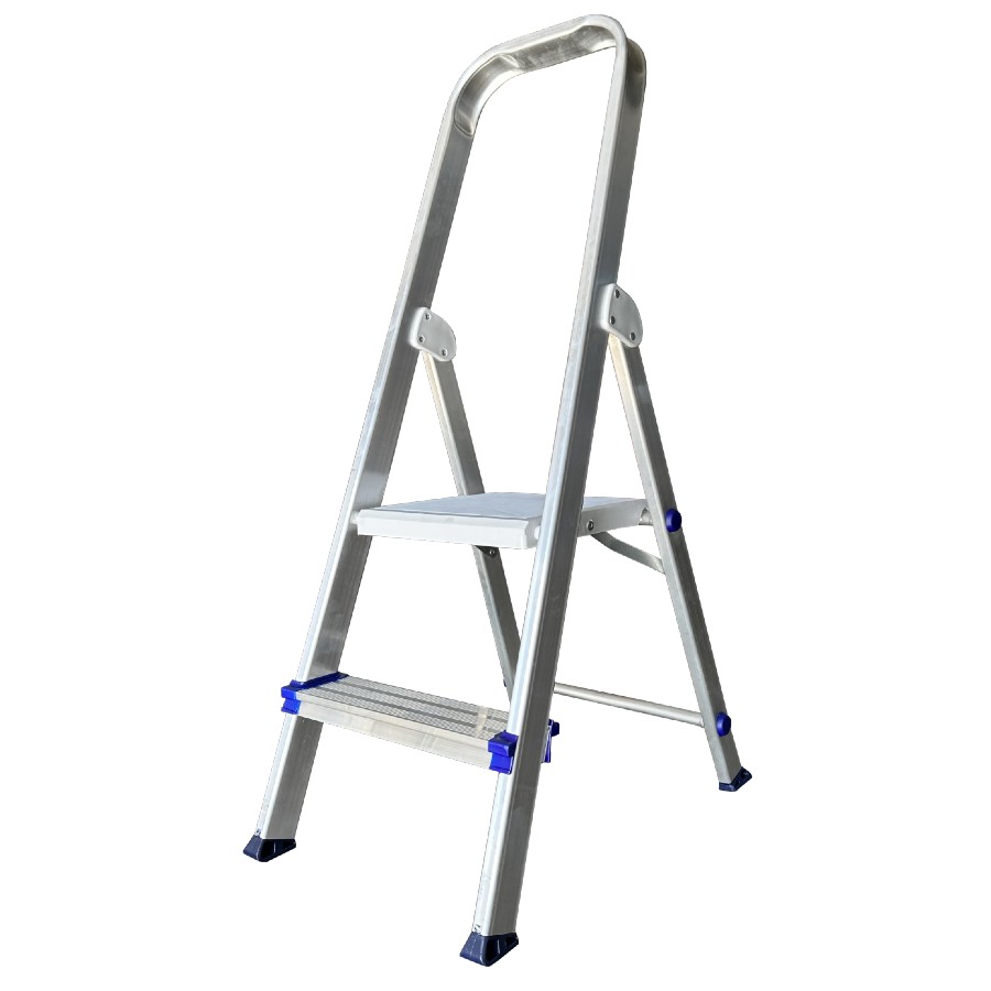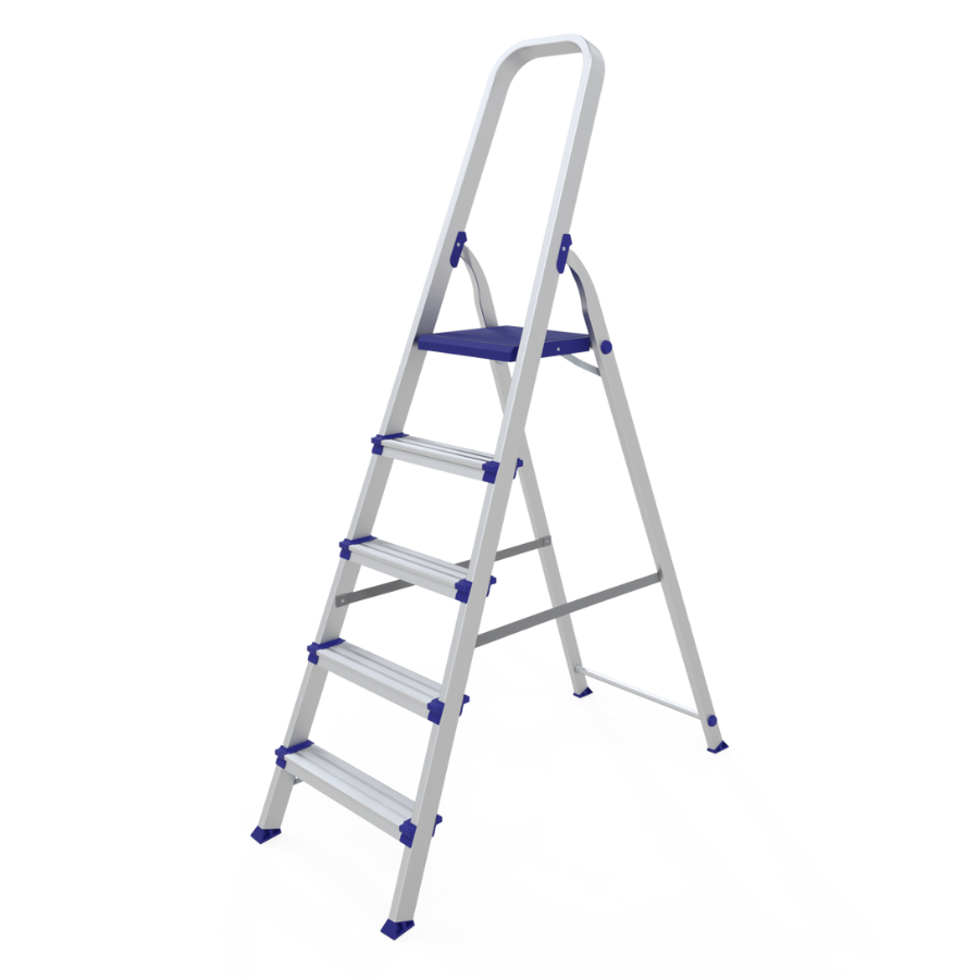 Escadote com degrau largo e uma subida provida de plataforma e guarda-corpos. Está construído com os degraus em alumínio de 80 mm rebitados, obtendo uma rampa de subida resistente e estável. A abertura acidental é impedida pela plataforma autobloqueante e cintas de segurança de 7 e 8 degraus.