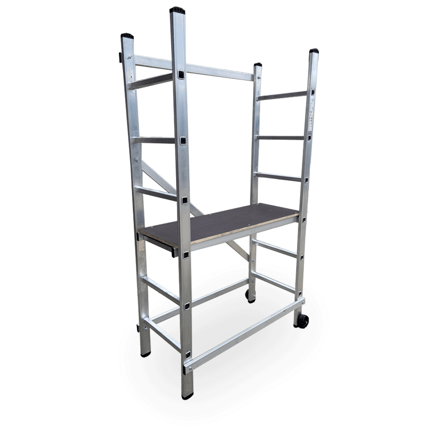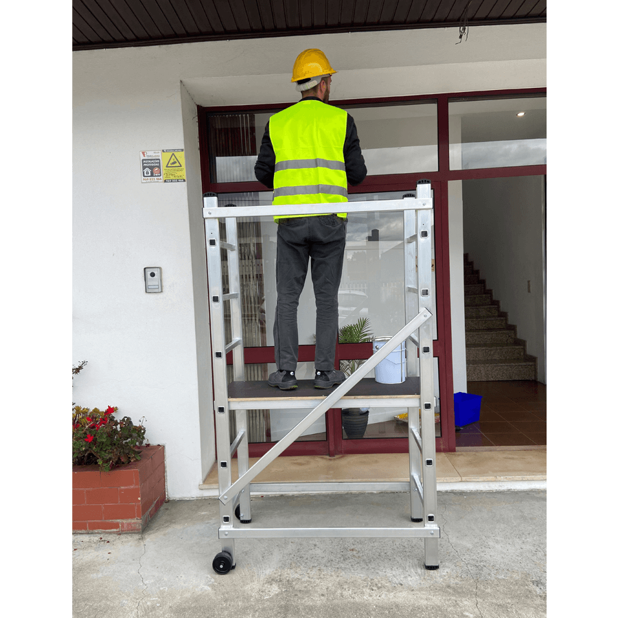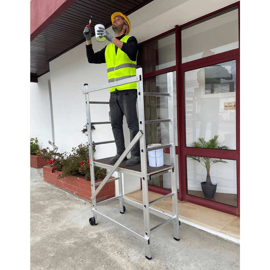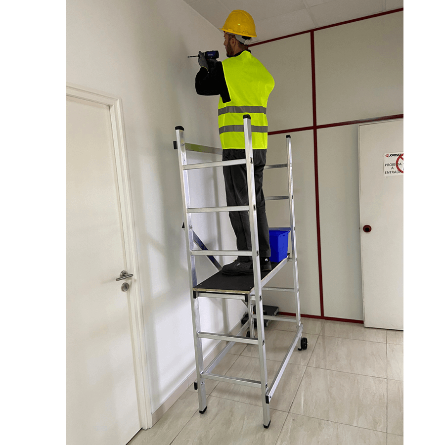 Andaime em alumínio ideal para utilização em alturas até 3 m, construído em alumínio de alta resistência os degraus estão cravados aos montantes as barras diagonais e horizontais depois de fixas criam uma estrutura muito seguro e robusta. Pensado para trabalhos em interiores é de fácil movimentação e graças à sua largura/altura passa facilmente através de portas sem que seja necessário desmontar. Equipado com rodas deslizantes de 100 mm de diâmetro, quando esta posiciona em posição de trabalho assenta de forma estável nos pés antiderrapantes. Ideal para pequenas reparações, aplicadores de tetos falsos, picheleiros, construção etc….