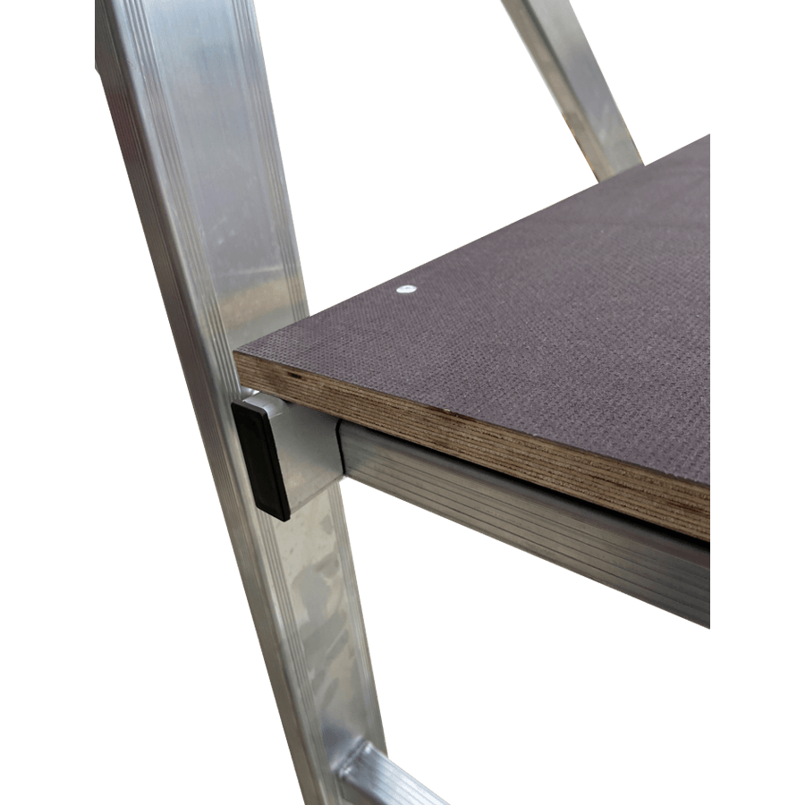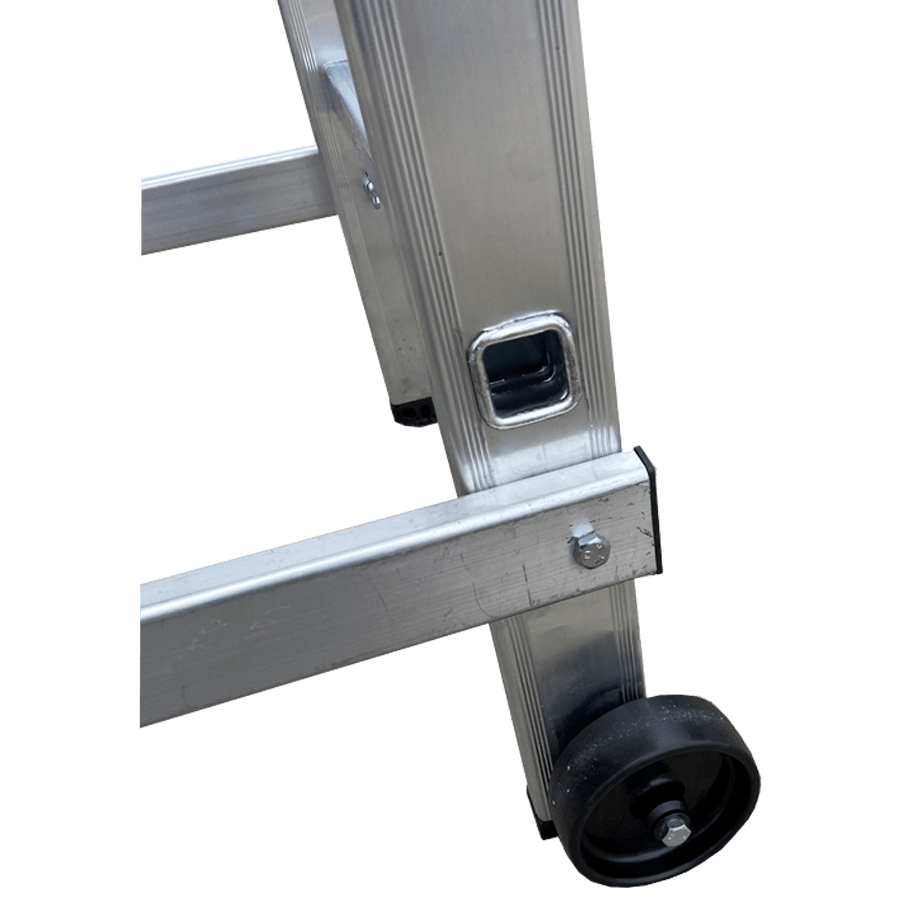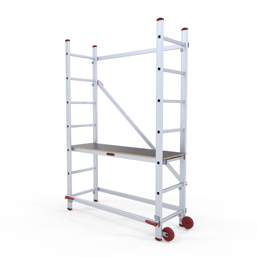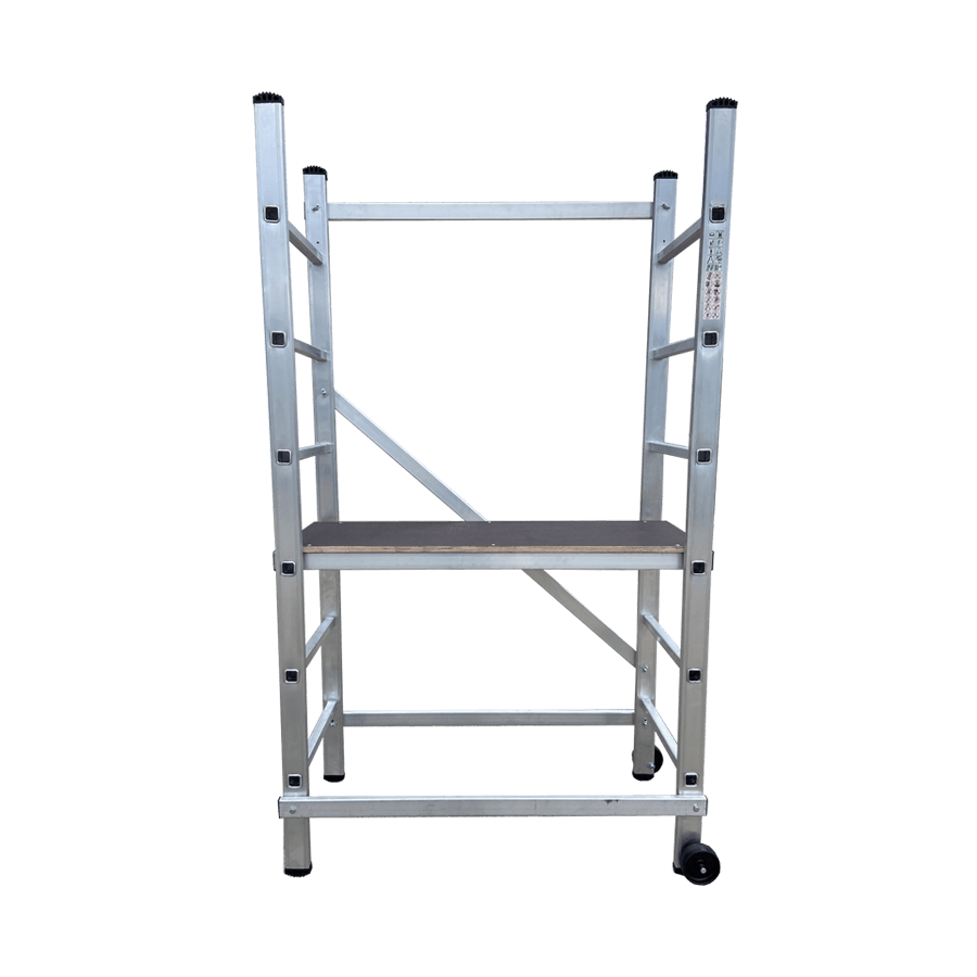 Andaime em alumínio ideal para utilização em alturas até 3 m, construído em alumínio de alta resistência os degraus estão cravados aos montantes as barras diagonais e horizontais depois de fixas criam uma estrutura muito seguro e robusta. Pensado para trabalhos em interiores é de fácil movimentação e graças à sua largura/altura passa facilmente através de portas sem que seja necessário desmontar. Equipado com rodas deslizantes de 100 mm de diâmetro, quando esta posiciona em posição de trabalho assenta de forma estável nos pés antiderrapantes. Ideal para pequenas reparações, aplicadores de tetos falsos, picheleiros, construção etc….