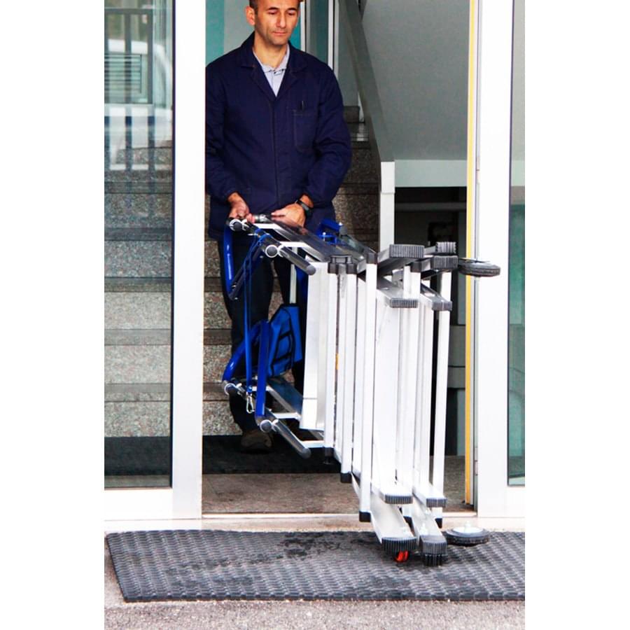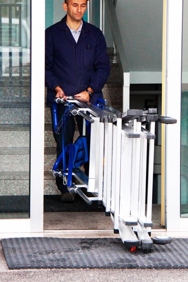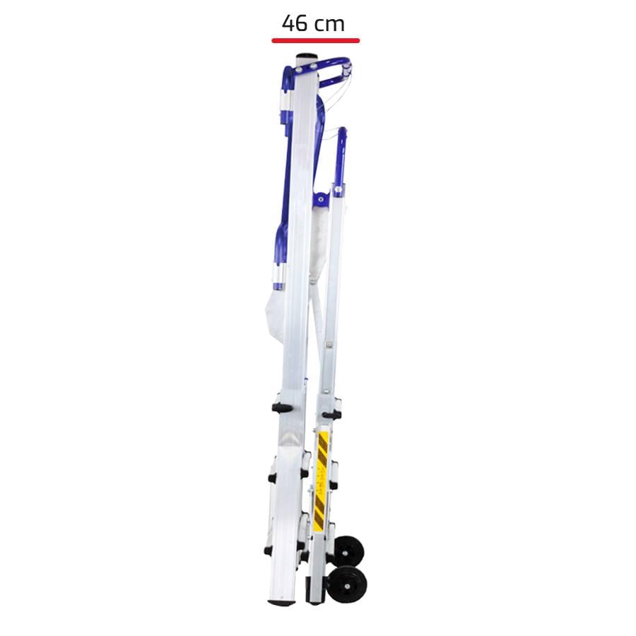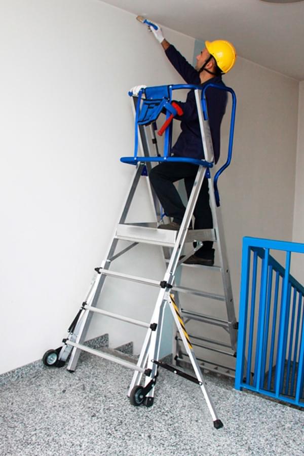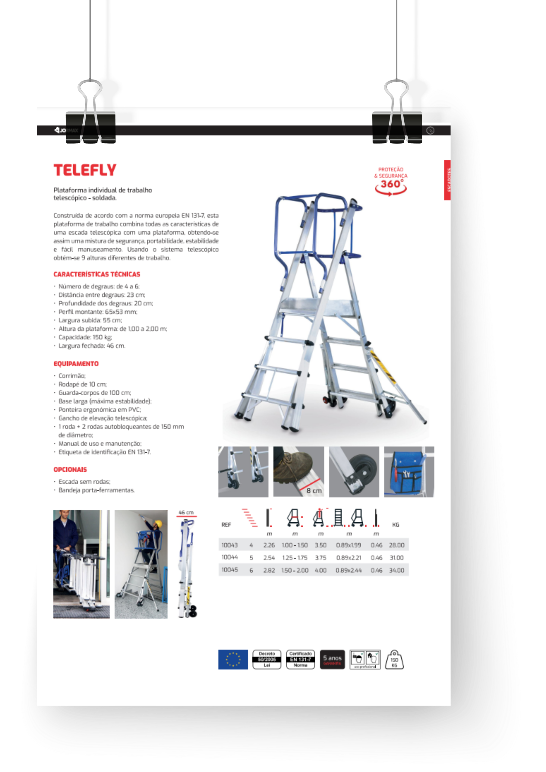 Construída de acordo com a norma europeia EN 131-7, esta plataforma de trabalho combina todas as características de um escadote telescópico com uma plataforma, obtendo-se assim uma mistura de segurança, portabilidade, estabilidade e fácil manuseamento. Usando o sistema telescópico obtém-se 9 alturas diferentes de trabalho.