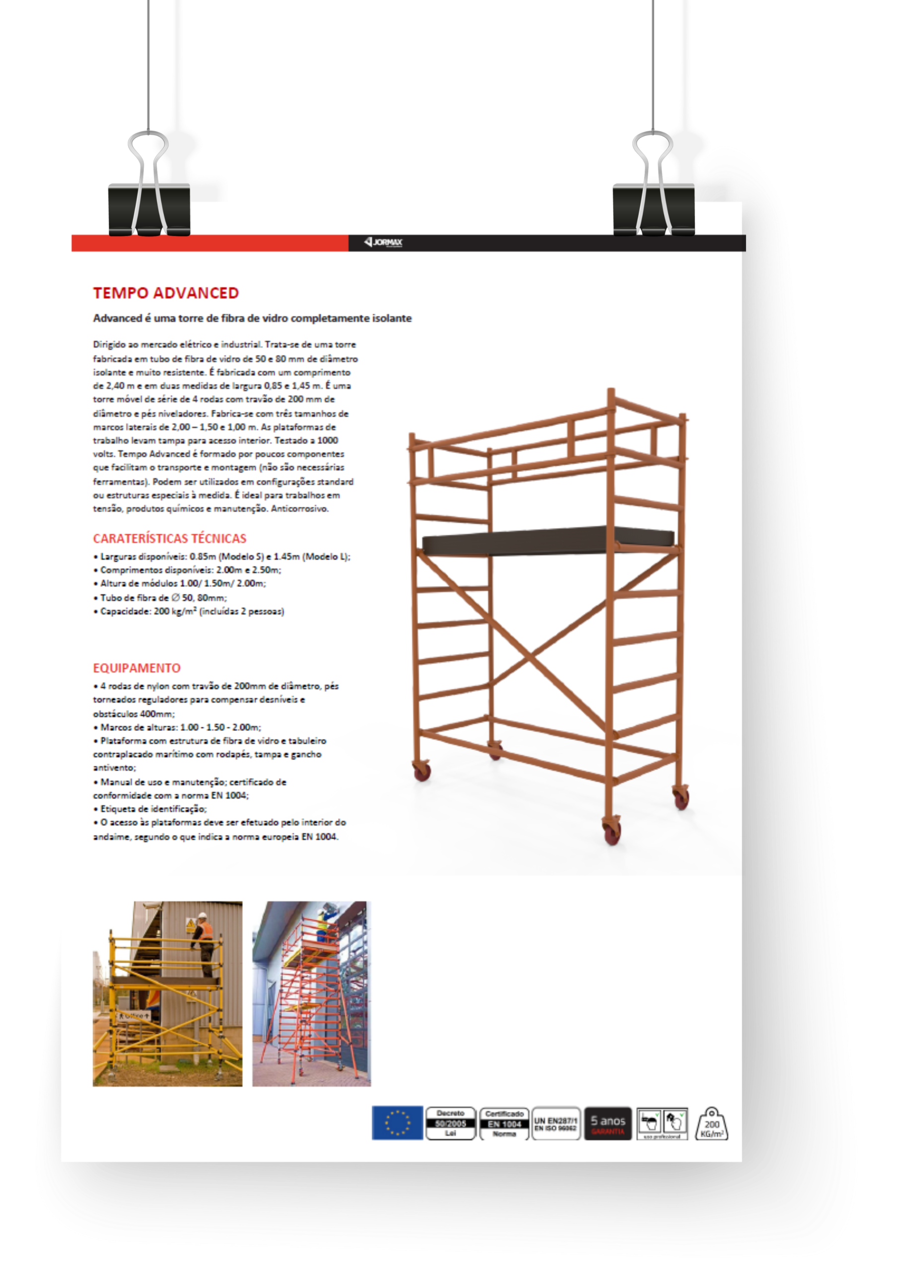 Dirigido ao mercado elétrico e industrial. Trata-se de uma torre fabricada em tubo de fibra de vidro de 50 e 80 mm de diâmetro isolante e muito resistente. É fabricada com um comprimento de 2,40 m e em duas medidas de largura 0,85 e 1,45 m. É uma torre móvel de série de 4 rodas com travão de 200 mm de diâmetro e pés niveladores. Fabrica-se com três tamanhos de marcos laterais de 2,00 – 1,50 e 1,00 m. As plataformas de trabalho levam tampa para acesso interior. Testado a 1000 volts. Tempo Advanced é formado por poucos componentes que facilitam o transporte e montagem (não são necessárias ferramentas). Podem ser utilizados em configurações standard ou estruturas especiais à medida. É ideal para trabalhos em tensão, produtos químicos e manutenção. Anticorrosivo.