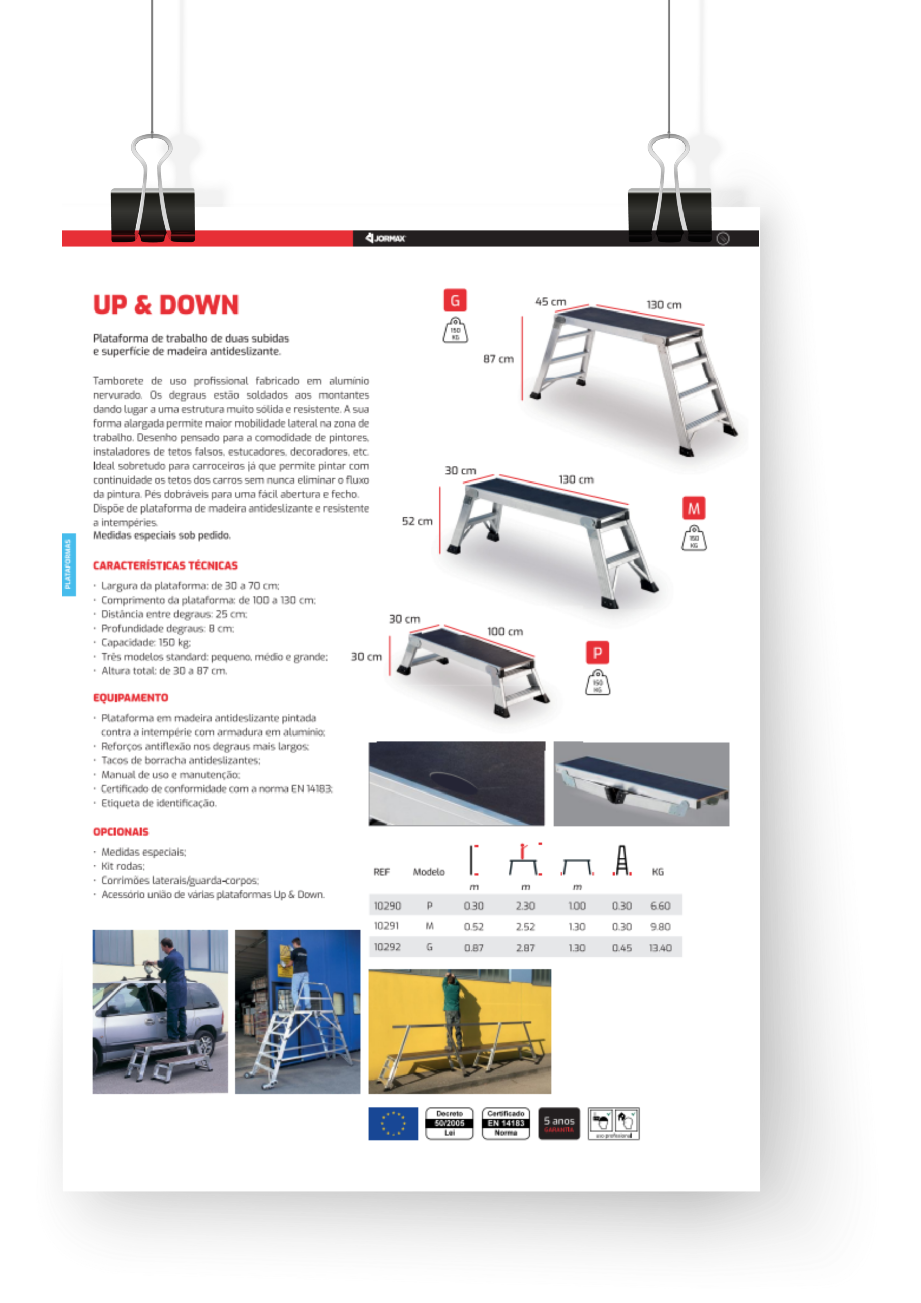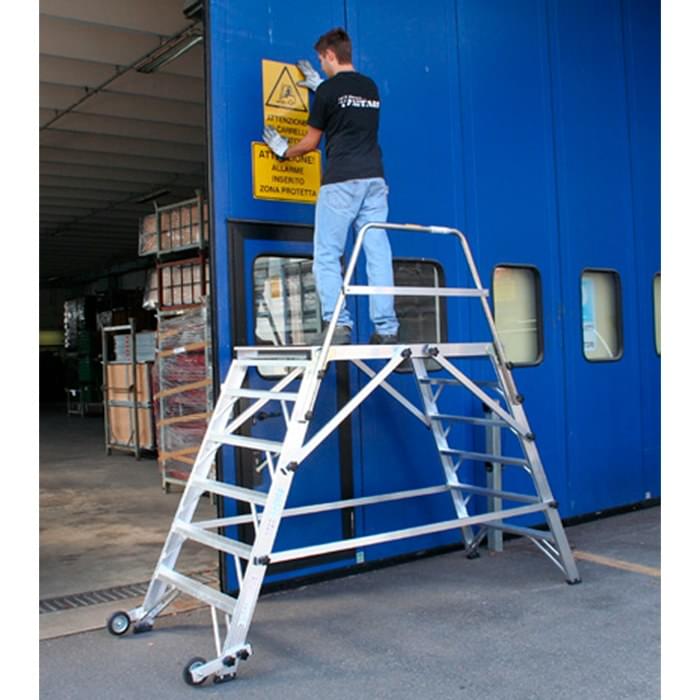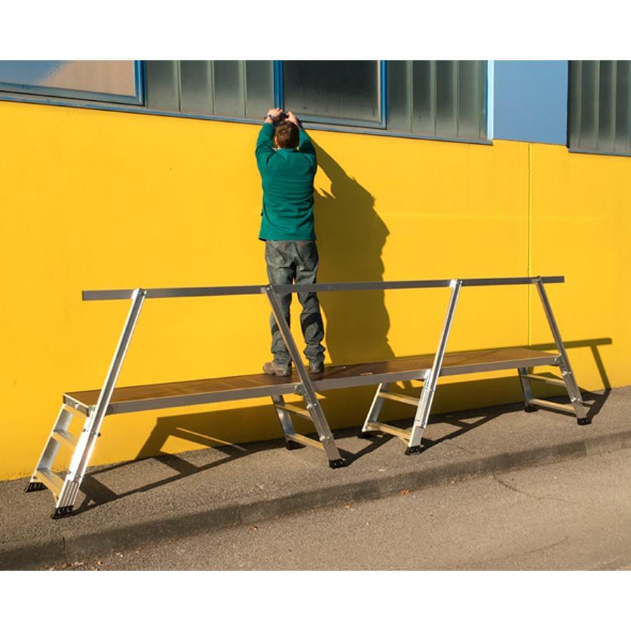 Plataforma de trabalho de duas subidas e superfície de madeira antideslizante.