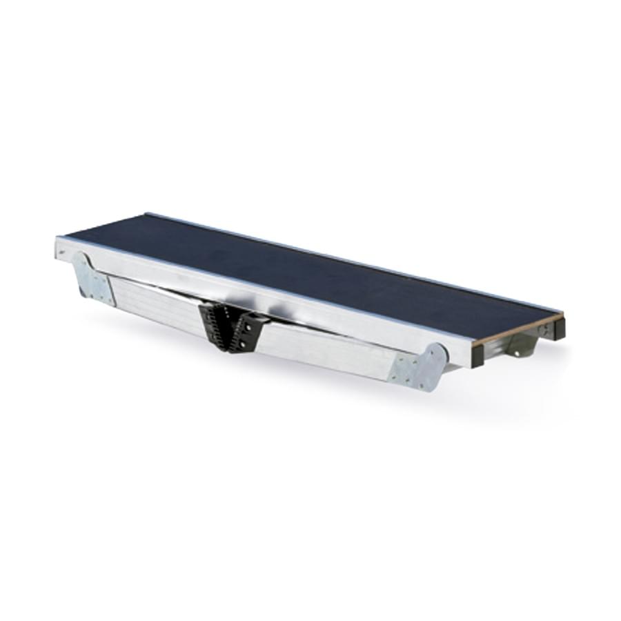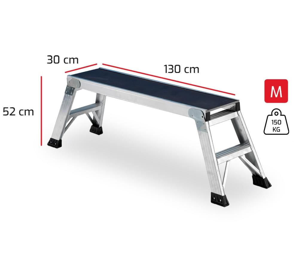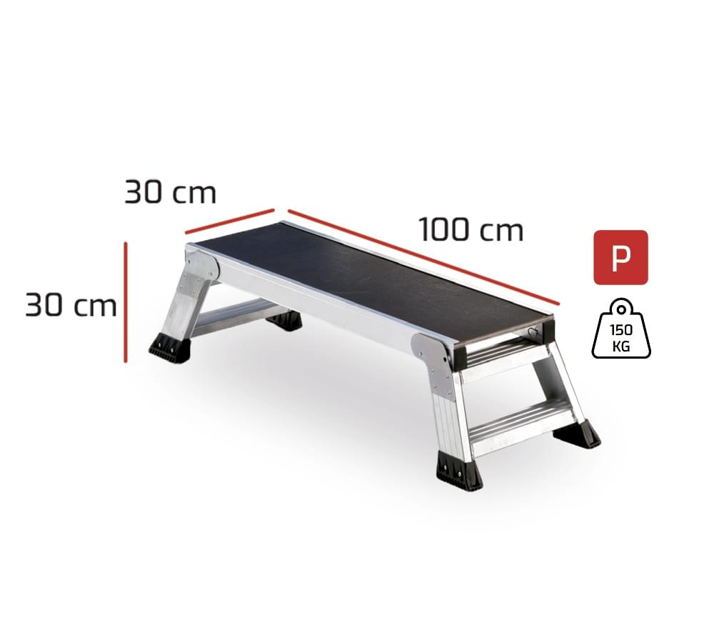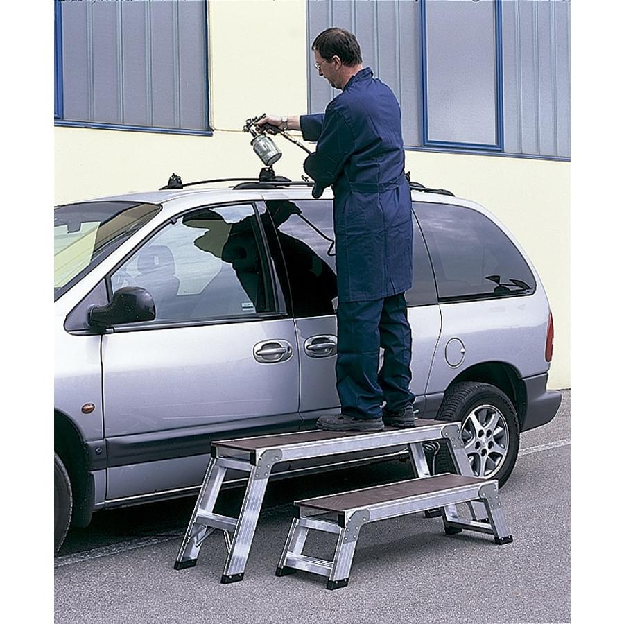 Tamborete de uso profissional fabricado em alumínio nervurado. Os degraus estão soldados aos montantes dando lugar a uma estrutura muito sólida e resistente. A sua forma alargada permite maior mobilidade lateral na zona de trabalho. Desenho pensado para a comodidade de pintores, instaladores de tetos falsos, estucadores, decoradores, etc. Ideal sobretudo para carroceiros já que permite pintar com continuidade os tetos dos carros sem nunca eliminar o fluxo da pintura. Pés dobráveis para uma fácil abertura e fecho. Dispõe de plataforma de madeira antideslizante e resistente a intempéries.