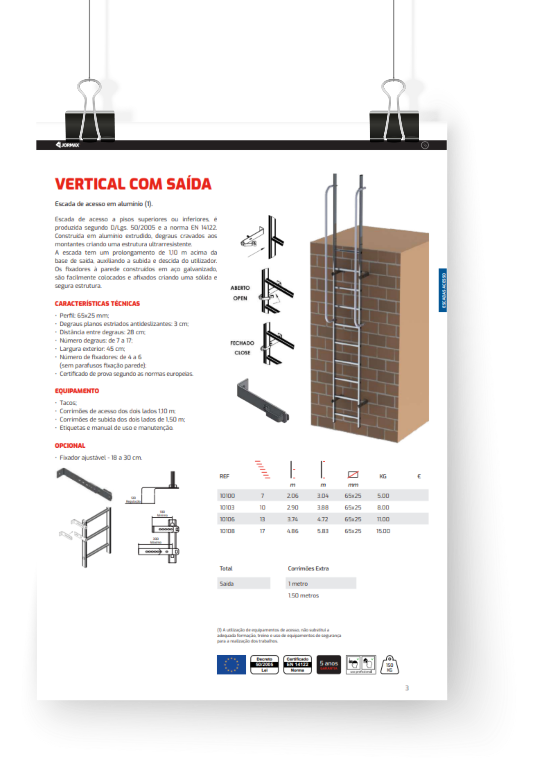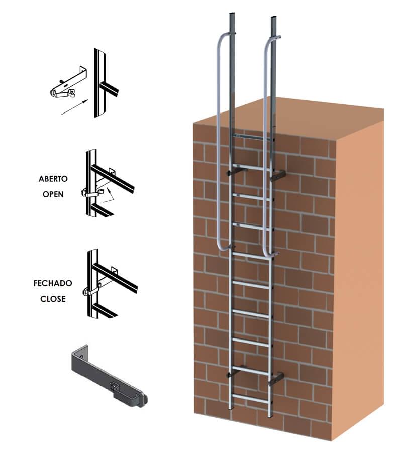 criando uma estrutura ultrarresistente. A escada tem um prolongamento de 1,10 m acima da base de saída, auxiliando a subida e descida do utilizador. Os fixadores à parede construídos em aço galvanizado, são facilmente colocados e afixados criando uma sólida e segura estrutura.
